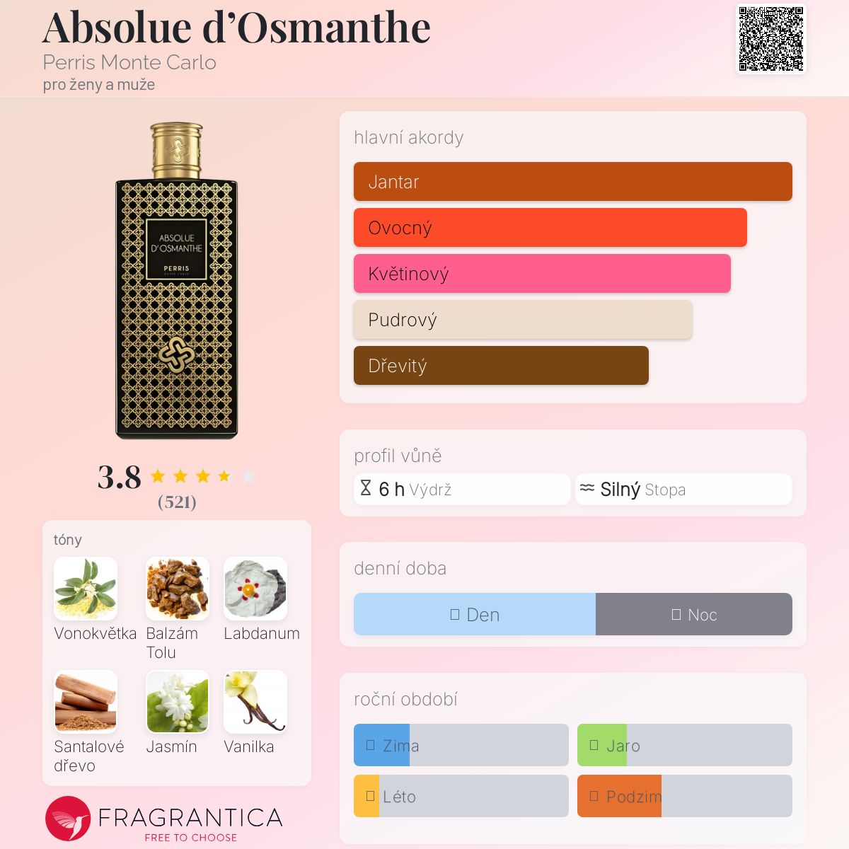 Absolue d’Osmanthe podle Perris Monte Carlo je vůně pro ženy a muže. Absolue d’Osmanthe byl/a uveden/a v roce 2016. Vrchní tóny jsou Vonokvětka, Švestka a Růžový pepř; střední tóny jsouBalzám Tolu a Jasmín Sambac ; základní tóny jsou Labdanum, Santalové dřevo a Vanilka.