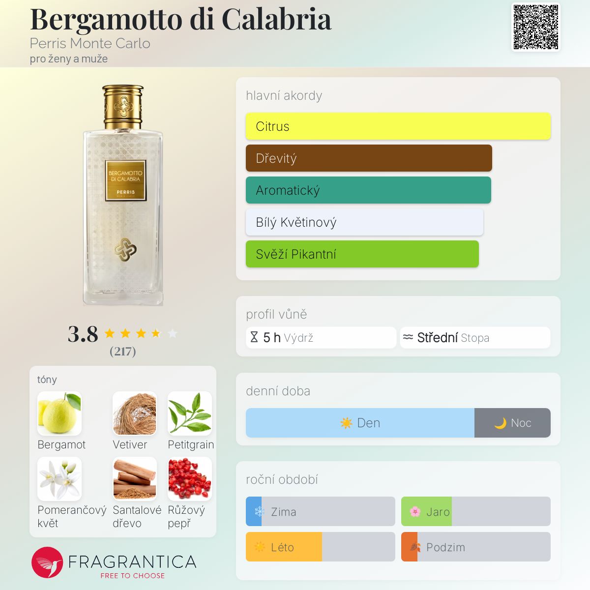 Bergamotto di Calabria podle Perris Monte Carlo je Citrus Aromatic vůně pro ženy a muže. Bergamotto di Calabria byl/a uveden/a v roce 2018. Bergamotto di Calabria byl/a vytvořen/a Gian Luca Perris a Luca Maffei. Vrchní tóny jsou Bergamot, Paraguajský petitgrain, Růžový pepř a Pepř; střední tóny jsouPomerančový květ, Neroli a Jasmín ; základní tóny jsou Haitský vetiver, Santalové dřevo, Kosatec a Pižmo.