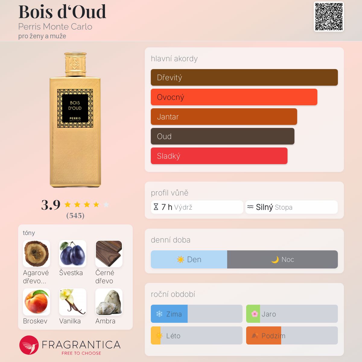 Bois d‘Oud podle Perris Monte Carlo je Orientální Spicy vůně pro ženy a muže. Bois d‘Oud byl/a uveden/a v roce 2012. Vrchní tón je Bergamot ; střední tóny jsouAgarové dřevo (oud), Švestka, Broskev, Růže, Kosatec, Jasmín a Pomerančový květ ; základní tóny jsou Černé dřevo, Vanilka, Ambra, Labdanum, Pačuli, Cedr a Pižmo.