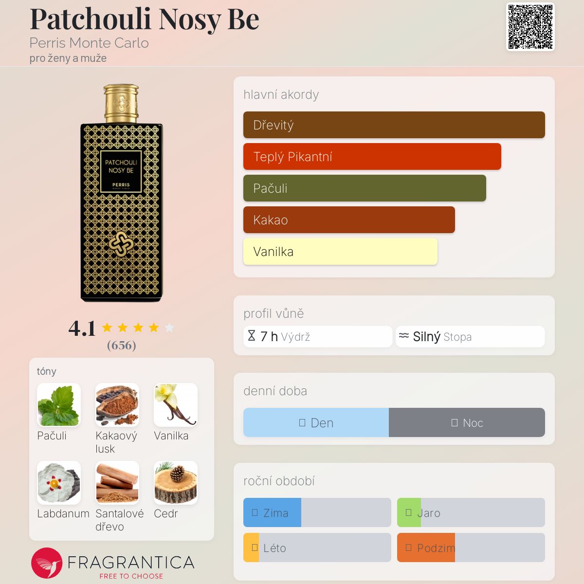 Patchouli Nosy Be podle Perris Monte Carlo je Woody Spicy vůně pro ženy a muže. Patchouli Nosy Be byl/a uveden/a v roce 2014. Vrchní tóny jsou Pačuli a Růžový pepř; střední tóny jsouKakao a Labdanum ; základní tóny jsou Pačuli, Vanilka, Santalové dřevo a Cedr.