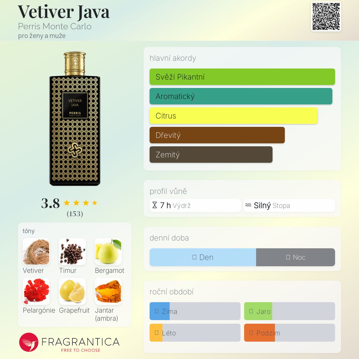 Vetiver Java podle Perris Monte Carlo je Woody Spicy vůně pro ženy a muže. Vetiver Java byl/a uveden/a v roce 2021. "Nosem" za touto vůní je Gian Luca Perris. Vrchní tóny jsou Timur, Kalábrijský bergamot a Grapefruit; střední tóny jsouJava vetiverový olej a Pelargónie ; základní tóny jsou Jantar (ambra) a Pižmo.