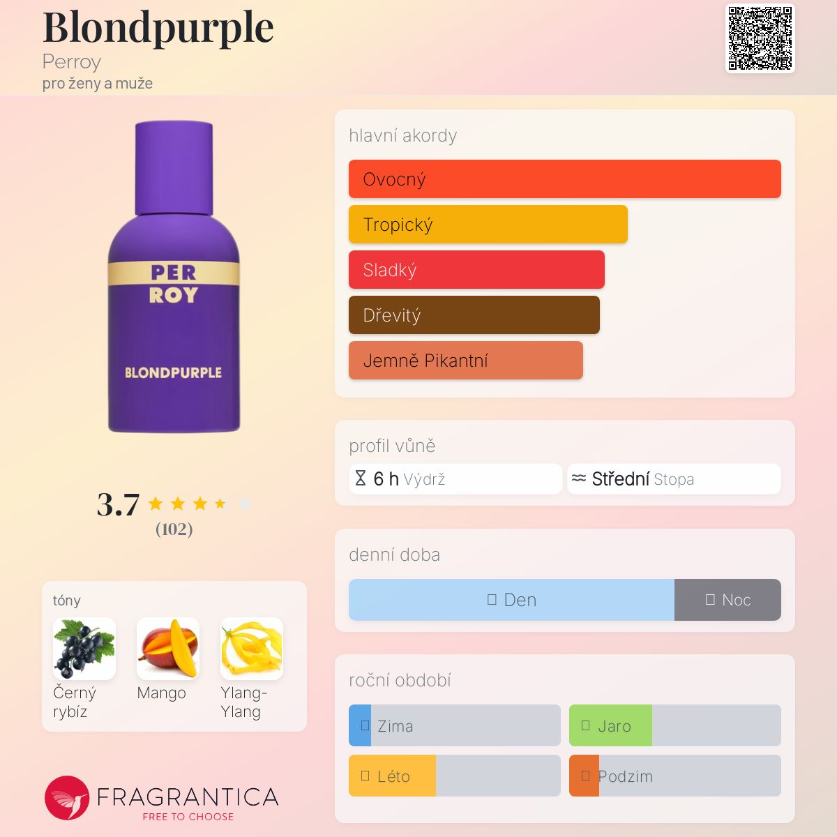 Blondpurple podle Perroy je Floral Fruity Gourmand vůně pro ženy a muže. Toto je nová vůně. Blondpurple byl/a uveden/a v roce 2024. "Nosem" za touto vůní je Arnaud Poulain. Vrchní tón je Mango ; střední tón jeČerný rybíz ; základní tón je Ylang-Ylang.