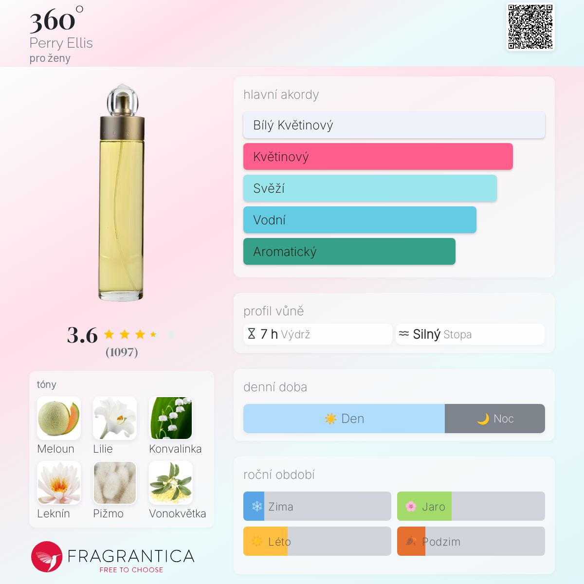 360° podle Perry Ellis je Floral vůně pro ženy. 360° byl/a uveden/a v roce 1992. "Nosem" za touto vůní je Sophia Grojsman. Vrchní tóny jsou Meloun, Lilie, Vonokvětka, Mandarinka a Růže; střední tóny jsouKonvalinka, Leknín, Levandule a Šalvěj ; základní tóny jsou Pižmo, Santalové dřevo, Vetiver, Jantar (ambra) a Vanilka.