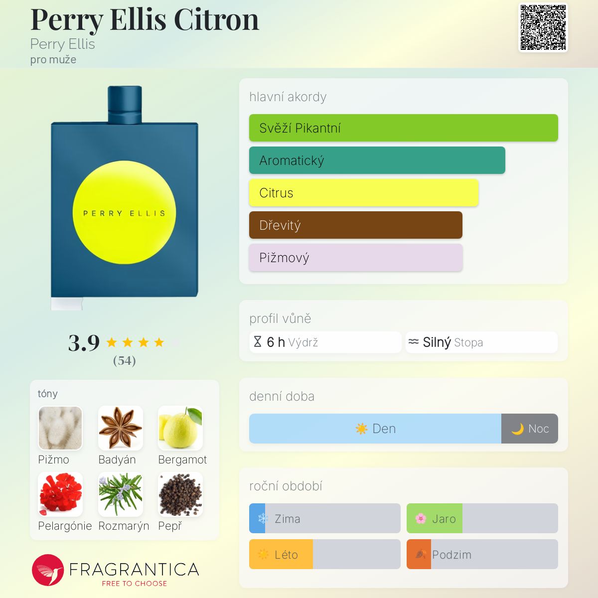 Perry Ellis Citron podle Perry Ellis je Aromatic Spicy vůně pro muže. Perry Ellis Citron byl/a uveden/a v roce 2015. "Nosem" za touto vůní je Gil Clavien. Vrchní tóny jsou Badyán, Bergamot, Mandarinka a Granny Smith jablko; střední tóny jsouPelargónie, Rozmarýn, Černý pepř a Levandule ; základní tóny jsou Pižmo, Týkové dřevo, Ambroxan a Cedr.
