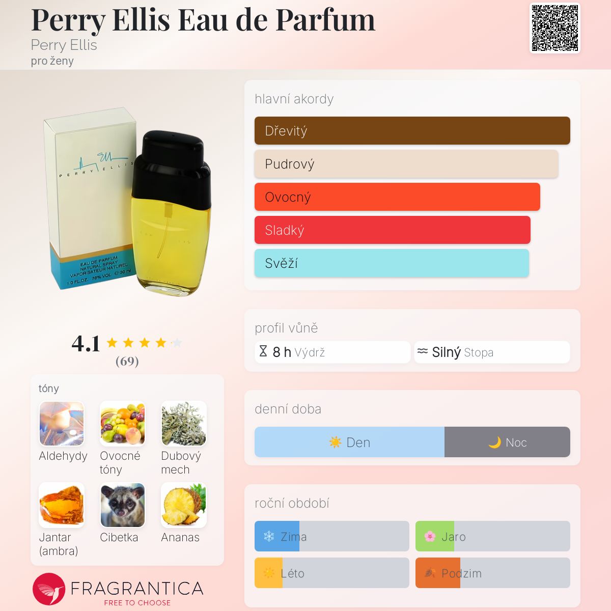 Perry Ellis Eau de Parfum podle Perry Ellis je Floral Aldehyde vůně pro ženy. Perry Ellis Eau de Parfum byl/a uveden/a v roce 1985. Vrchní tóny jsou Aldehydy, Ovocné tóny, Ananas, Fialka a Bergamot; střední tóny jsouYlang-Ylang, Růže, Jasmín, Pelargónie, Konvalinka a Kořen orris ; základní tóny jsou Dubový mech, Jantar (ambra), Cibetka, Vetiver, Pižmo, Santalové dřevo a Virginský cedr.