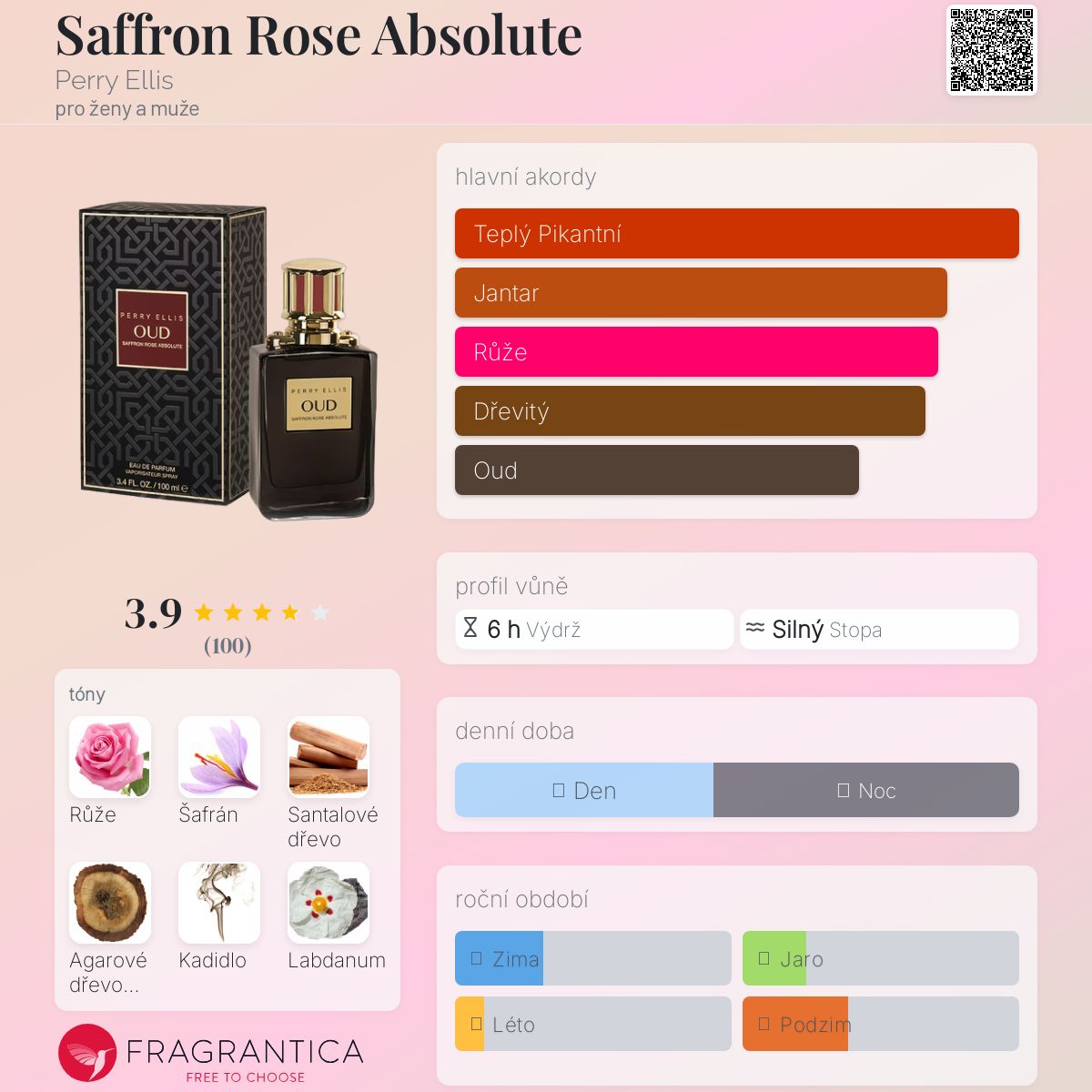 Saffron Rose Absolute podle Perry Ellis je Orientální Floral vůně pro ženy a muže. Saffron Rose Absolute byl/a uveden/a v roce 2015. Vrchní tóny jsou Černá růže a Šafrán; střední tóny jsouKadidlo a Labdanum ; základní tóny jsou Santalové dřevo a Agarové dřevo (oud).