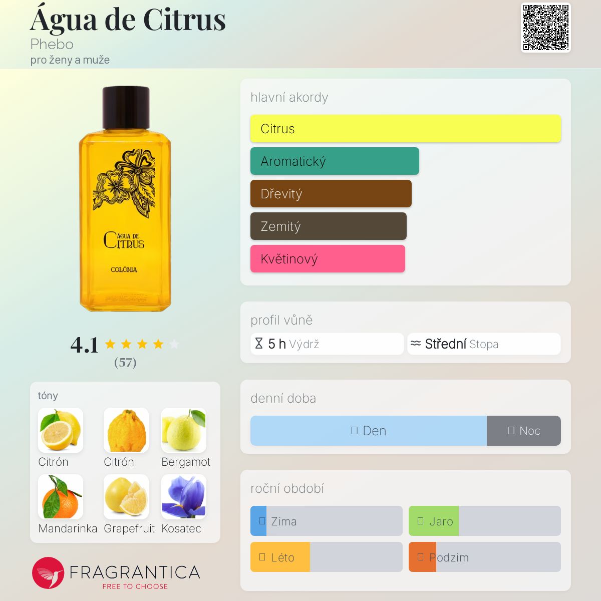 Água de Citrus podle Phebo je Citrus vůně pro ženy a muže. Água de Citrus byl/a uveden/a v roce 2008. Vrchní tóny jsou Citrón, Citrón, Bergamot, Mandarinka a Grapefruit; střední tóny jsouKvět kosatce, Sporýš, Frézie a Fialka ; základní tóny jsou Cedrový mech, Vetiver, Naplavené dříví a Labdanum.