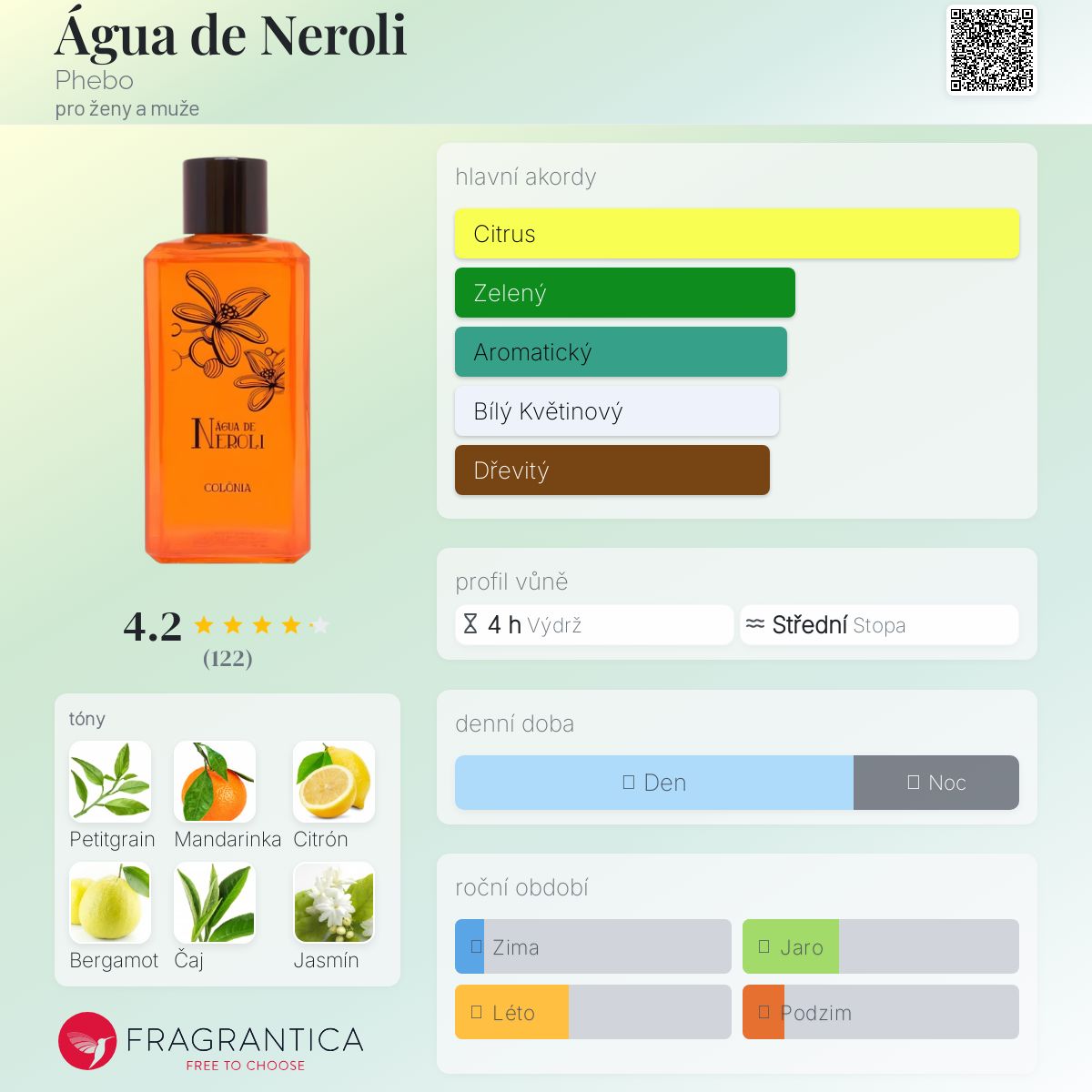 Água de Neroli podle Phebo je Citrus vůně pro ženy a muže. Água de Neroli byl/a uveden/a v roce 2008. Vrchní tóny jsou Citrusové listy, Italská mandarinka, Sicilský citron a Bergamot; střední tóny jsouZelený čaj a Jasmín ; základní tóny jsou Pižmo, Guajakové dřevo, Ambra a Fazole tonka.