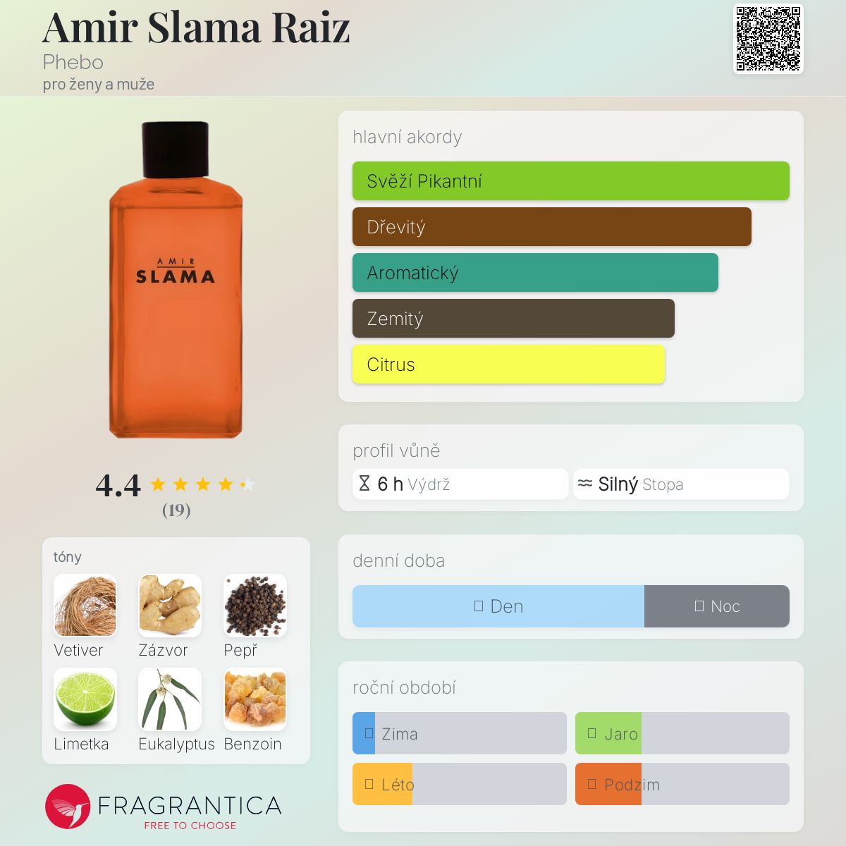 Amir Slama Raiz podle Phebo je Woody Spicy vůně pro ženy a muže. Amir Slama Raiz byl/a uveden/a v roce 2019. Vrchní tóny jsou Zázvor, Černý pepř a Limetka; střední tóny jsouEukalyptus, Magnólie a Rozmarýn ; základní tóny jsou Vetiver, Benzoin a Mech.