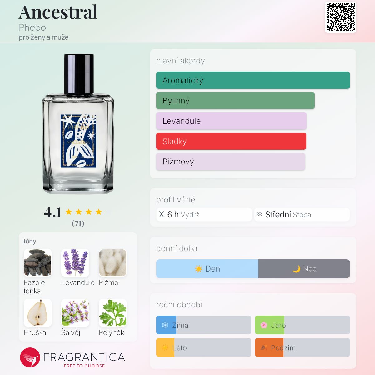 Ancestral podle Phebo je Woody Aromatic vůně pro ženy a muže. Toto je nová vůně. Ancestral byl/a uveden/a v roce 2025. "Nosem" za touto vůní je Ilias Ermenidis. Vrchní tóny jsou Šalvěj, Hruška a Pelyněk; střední tóny jsouLevandule, Růže a Gurjanský balzám ; základní tóny jsou Fazole tonka, Pižmo a Guajakové dřevo.