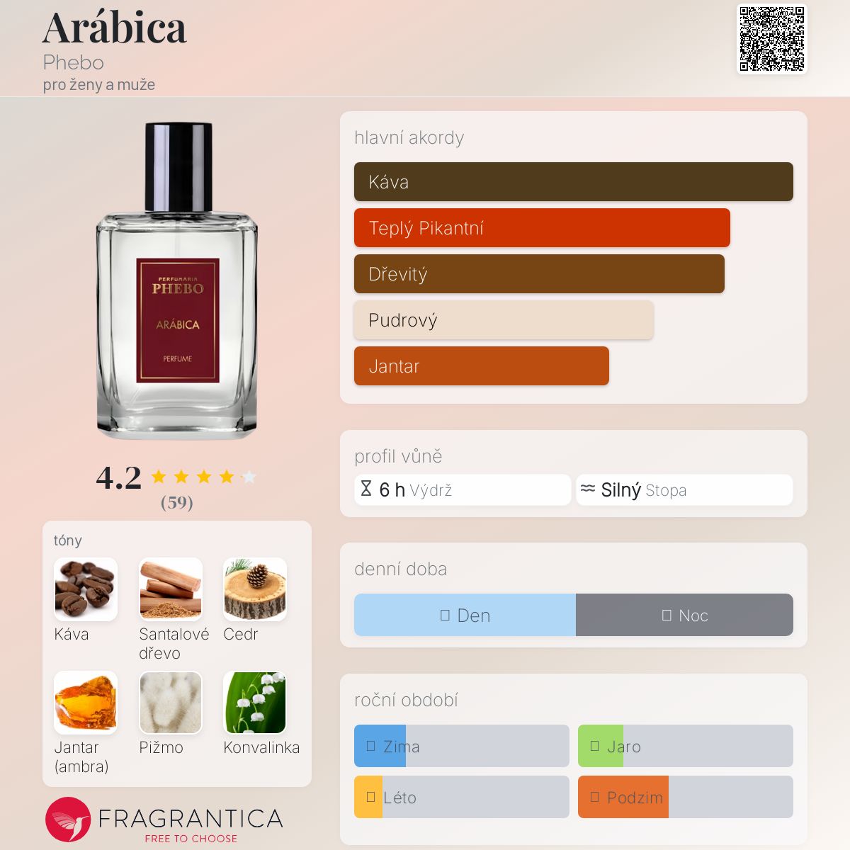 Arábica podle Phebo je Citrus vůně pro ženy a muže. Arábica byl/a uveden/a v roce 2019. Vrchní tóny jsou Káva, Bergamot a Citrón; střední tóny jsouKáva, Santalové dřevo a Konvalinka ; základní tóny jsou Cedr, Jantar (ambra) a Pižmo.