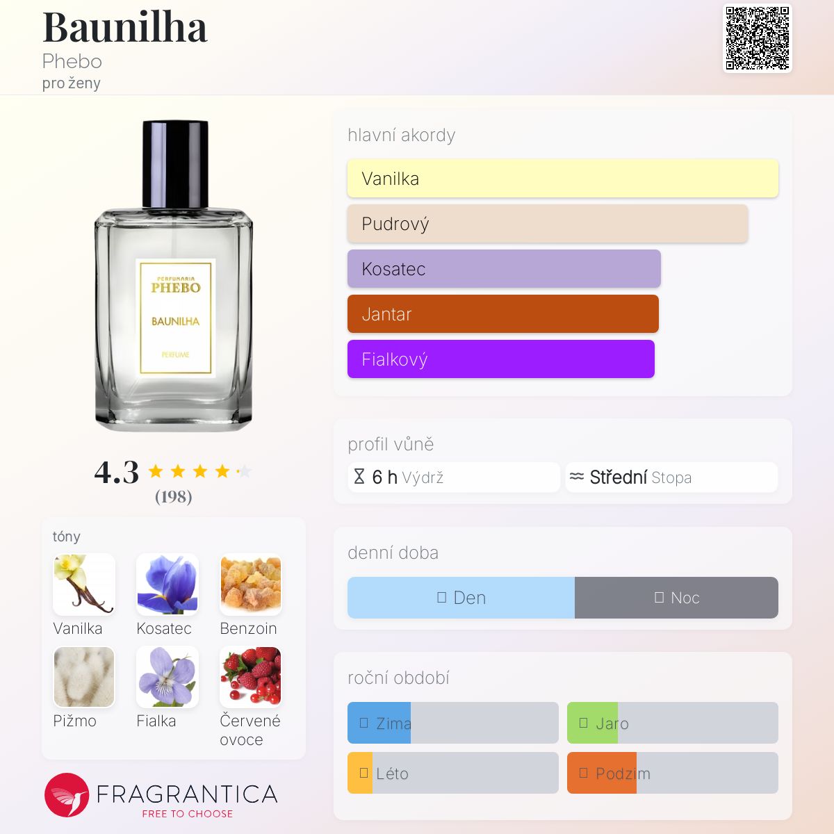 Baunilha podle Phebo je Orientální Floral vůně pro ženy. Baunilha byl/a uveden/a v roce 2015. Vrchní tóny jsou Červené ovoce, Limetka a Citrusy; střední tóny jsouKosatec, Fialka a Frézie ; základní tóny jsou Vanilka, Benzoin, Pižmo, Extrakty CO2 a Dřevité tóny.