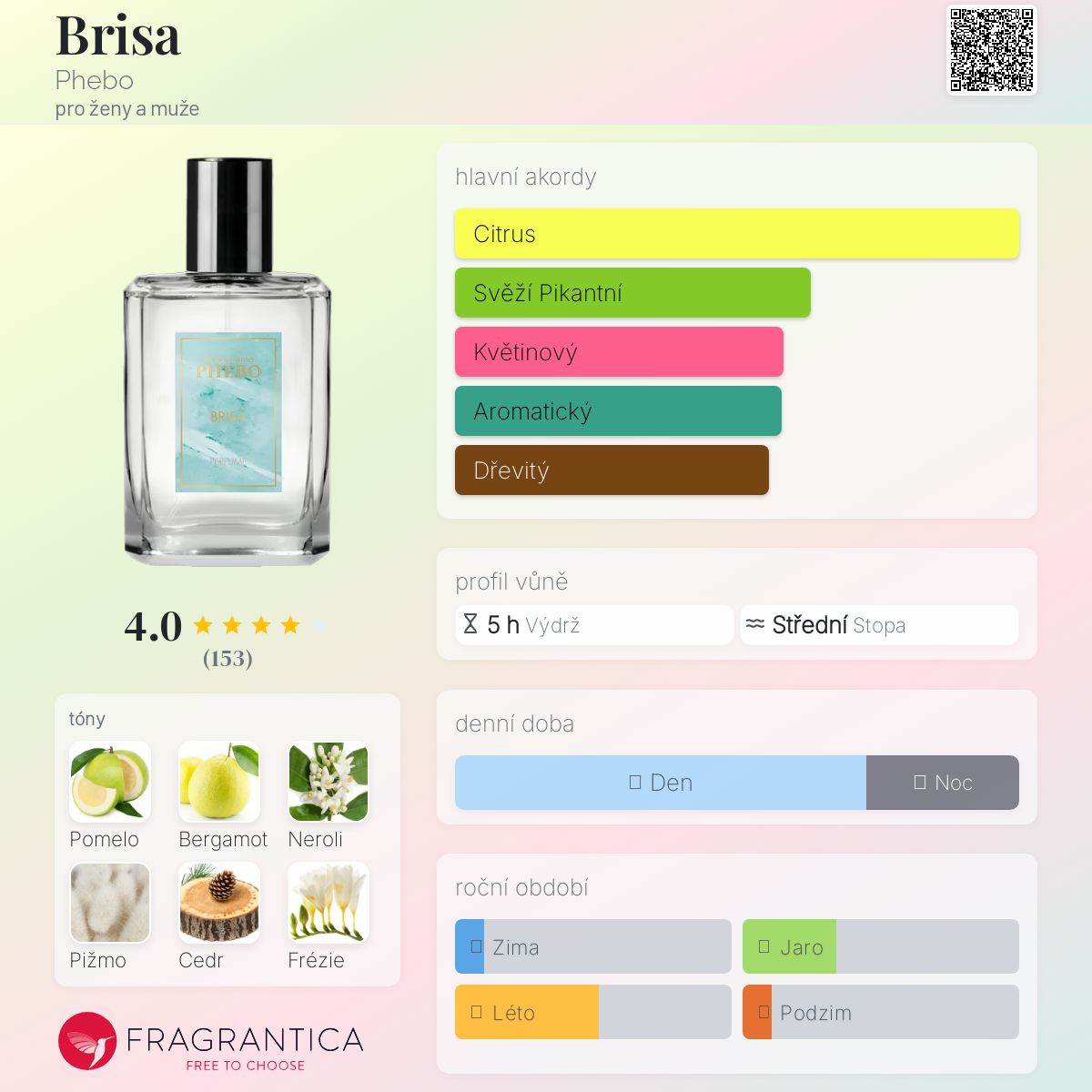 Brisa podle Phebo je Citrus vůně pro ženy a muže. Brisa byl/a uveden/a v roce 2019. Vrchní tóny jsou Pomelo, Bergamot a Frézie; střední tóny jsouNeroli, Cedr a Kardamom ; základní tóny jsou Pižmo, Cedr a Jantar (ambra).