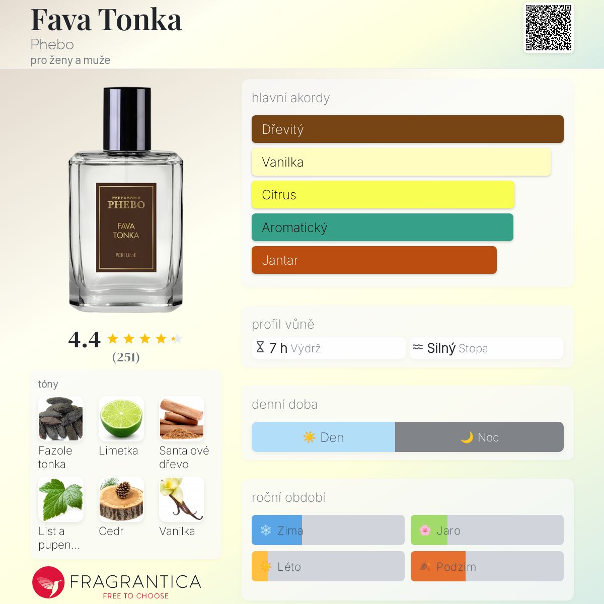 Fava Tonka podle Phebo je Orientální vůně pro ženy a muže. Fava Tonka byl/a uveden/a v roce 2019. "Nosem" za touto vůní je Gabriela Maldonado. Vrchní tóny jsou Limetka, Černý rybíz a Bergamot; střední tóny jsouFazole tonka, Vanilka a Benzoin ; základní tóny jsou Santalové dřevo, Cedr a Pižmo.