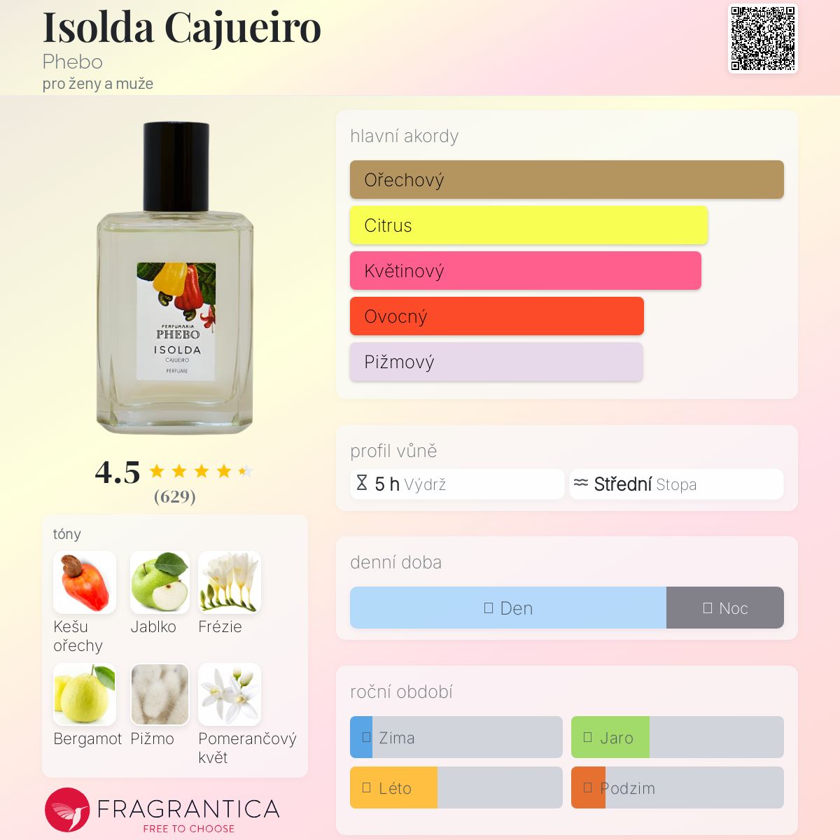 Isolda Cajueiro podle Phebo je Floral Fruity vůně pro ženy a muže. Isolda Cajueiro byl/a uveden/a v roce 2018. Vrchní tóny jsou Kešu ořechy, Jablko a Bergamot; střední tóny jsouFrézie, Pomerančový květ a Růže ; základní tóny jsou Pižmo, Kumarin a Jantar (ambra).