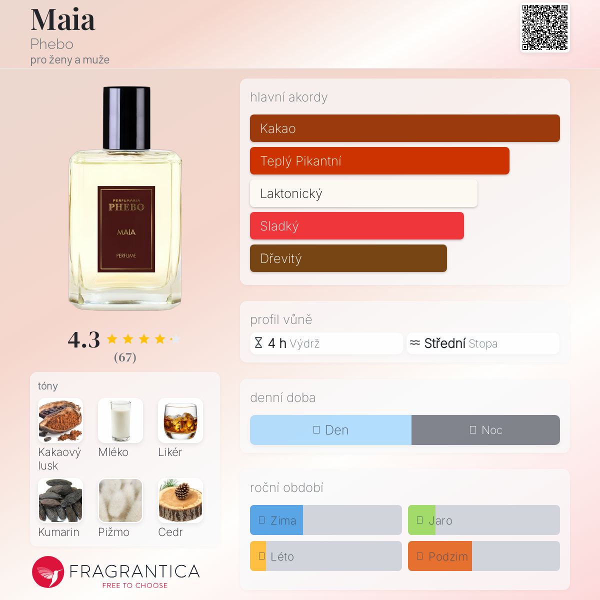 Maia podle Phebo je Orientální Vanilla vůně pro ženy a muže. Maia byl/a uveden/a v roce 2019. Vrchní tóny jsou Kakao, Mléko a Likér; střední tóny jsouKakao, Jasmín a Konvalinka ; základní tóny jsou Kumarin, Pižmo a Cedr.