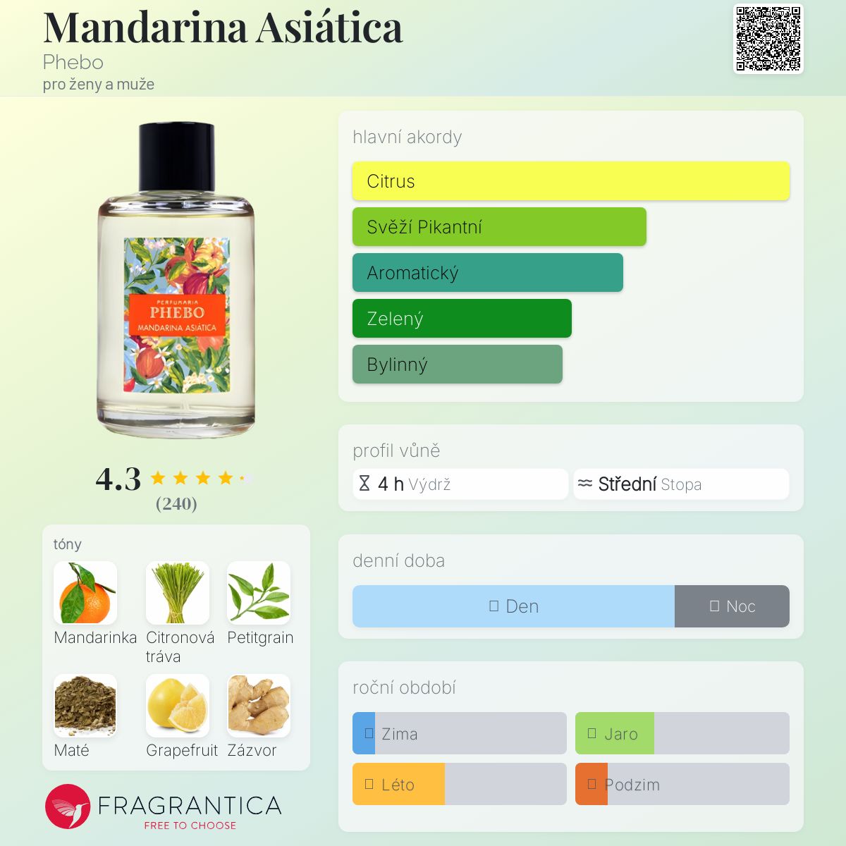 Mandarina Asiática podle Phebo je Citrus vůně pro ženy a muže. Mandarina Asiática byl/a uveden/a v roce 2020. Vrchní tóny jsou Mandarinka, Grapefruit a Zázvor; střední tóny jsouCitronová tráva, Petitgrain a Kardamom ; základní tóny jsou Maté, Pižmo a Jantar (ambra).