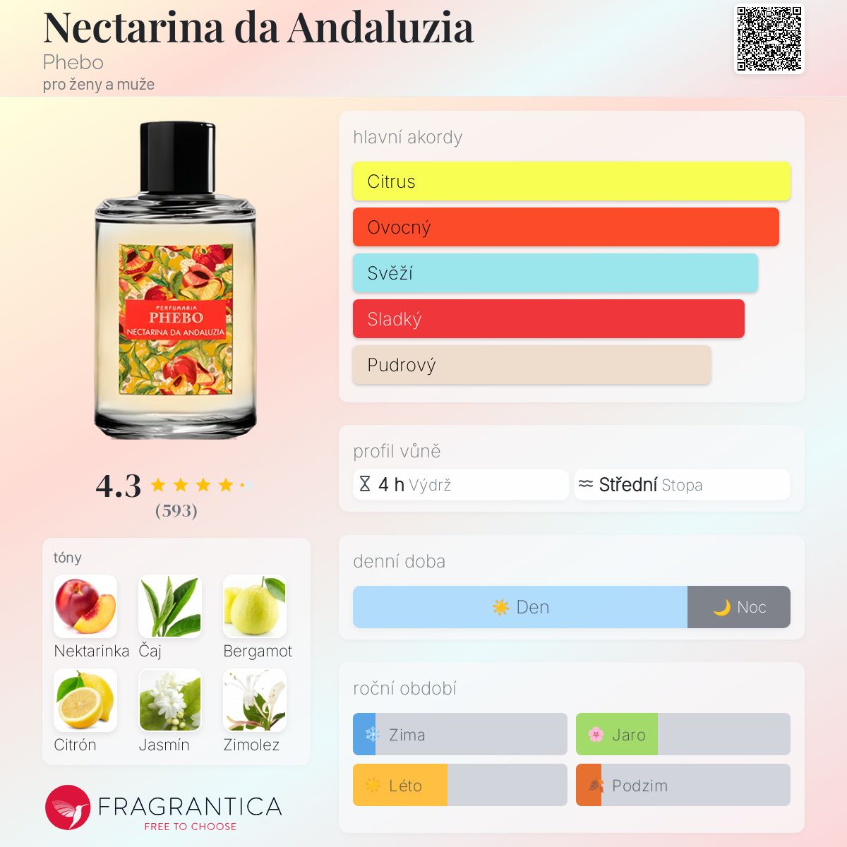 Nectarina da Andaluzia podle Phebo je Floral Fruity vůně pro ženy a muže. Nectarina da Andaluzia byl/a uveden/a v roce 2018. Vrchní tóny jsou Nektarinka, Bergamot a Sicilský citron; střední tóny jsouBílý čaj, Jasmín Sambac a Zimolez ; základní tóny jsou Pižmo, Bílý jantar (ambra) a Dubový mech.