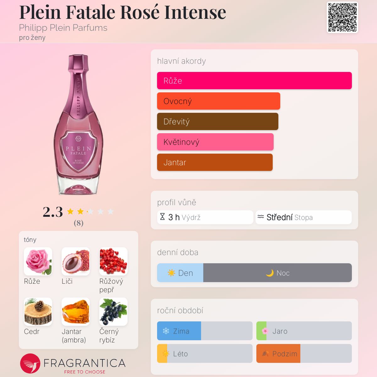 Plein Fatale Rosé Intense podle Philipp Plein Parfums je Floral Fruity vůně pro ženy. Toto je nová vůně. Plein Fatale Rosé Intense byl/a uveden/a v roce 2025. "Nosem" za touto vůní je Alberto Morillas. Vrchní tóny jsou Liči a Černý rybíz; střední tóny jsouDamašská růže a Růžový pepř ; základní tóny jsou Cedr, Jantar (ambra) a Santalové dřevo.