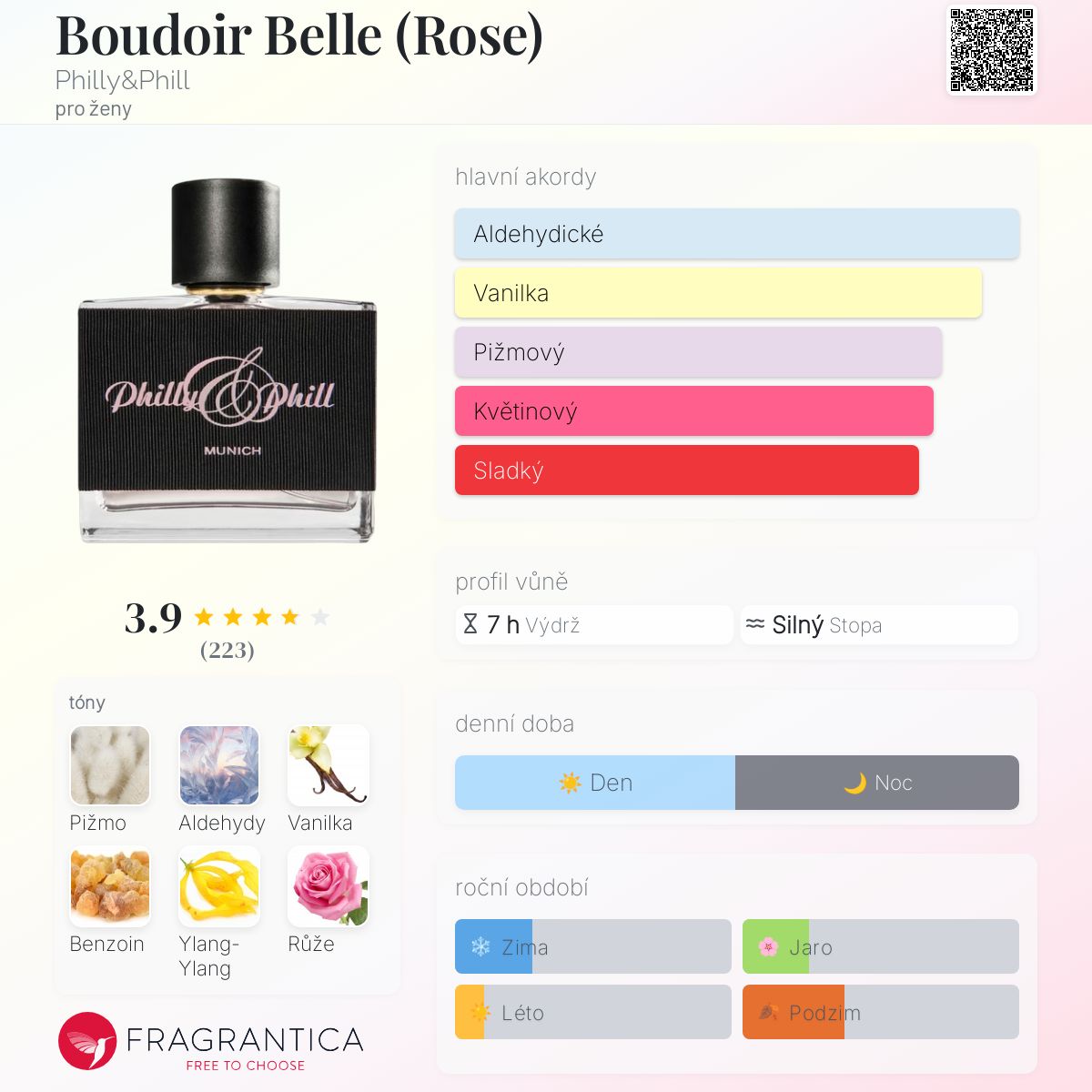 Boudoir Belle (Rose) podle Philly&Phill je Floral vůně pro ženy. Boudoir Belle (Rose) byl/a uveden/a v roce 2010. Vrchní tóny jsou Aldehydy a Hloh; střední tóny jsouYlang-Ylang a Růže ; základní tóny jsou Pižmo, Vanilka a Benzoin.