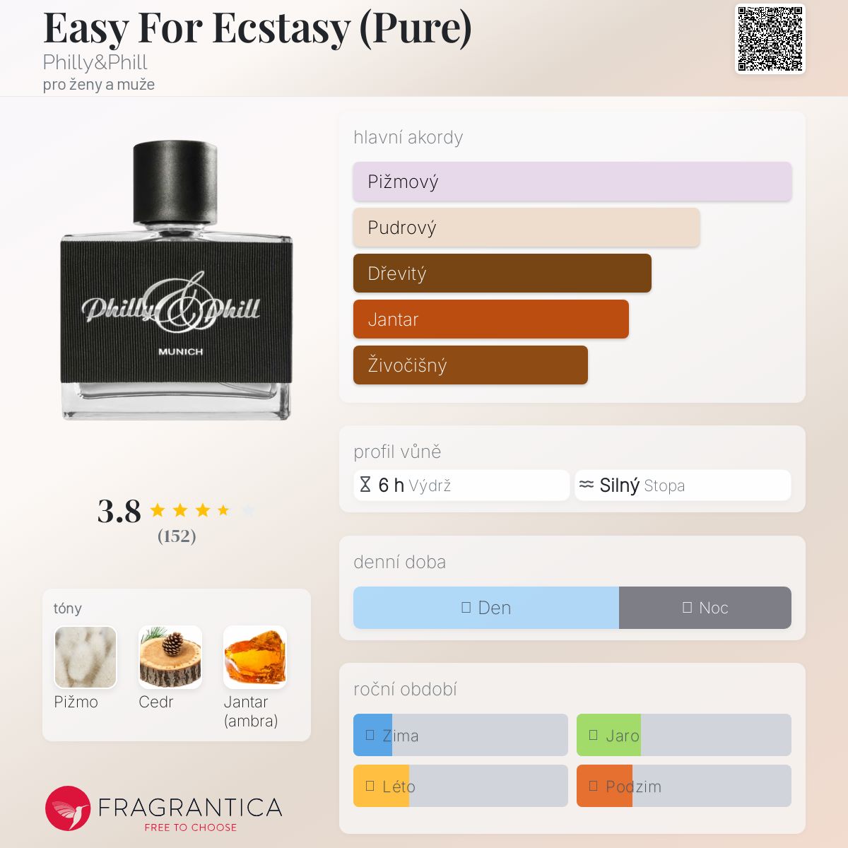 Easy For Ecstasy (Pure) podle Philly&Phill je Woody Floral Musk vůně pro ženy a muže. Easy For Ecstasy (Pure) byl/a uveden/a v roce 2013. Vrchní tón je Bílé pižmo ; střední tóny jsouCedr a Jantar (ambra) ; základní tón je Pižmo.