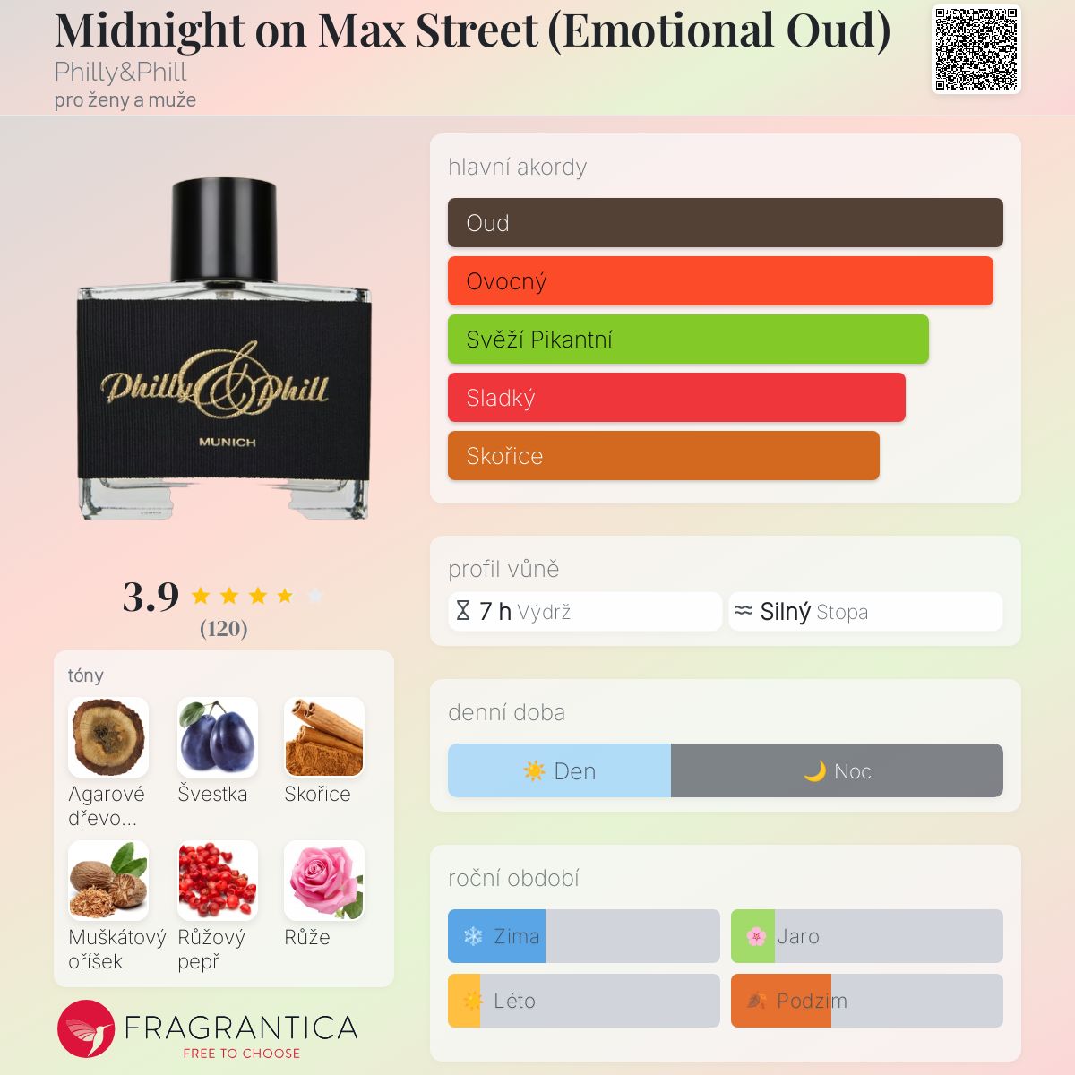 Midnight on Max Street (Emotional Oud) podle Philly&Phill je Orientální Spicy vůně pro ženy a muže. Midnight on Max Street (Emotional Oud) byl/a uveden/a v roce 2012. Vrchní tóny jsou Růžový pepř a Pomeranč; střední tóny jsouŠvestka, Muškátový oříšek a Růže ; základní tóny jsou Agarové dřevo (oud), Skořice a Vanilka.
