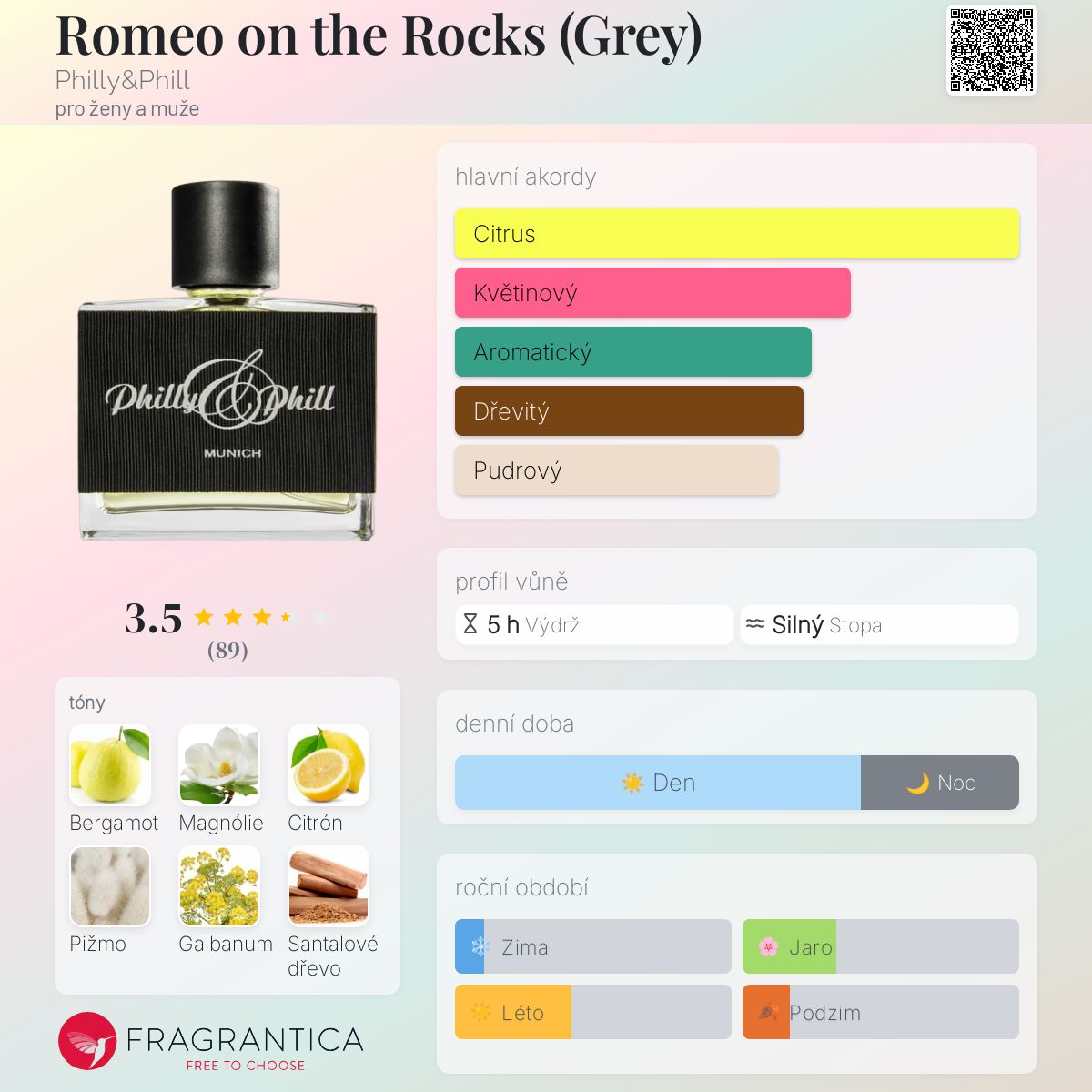 Romeo on the Rocks (Grey) podle Philly&Phill je Floral Woody Musk vůně pro ženy a muže. Romeo on the Rocks (Grey) byl/a uveden/a v roce 2010. Vrchní tóny jsou Bergamot, Citrón a Galbanum; střední tóny jsouMagnólie, Santalové dřevo a Cedr ; základní tóny jsou Pižmo a Mech.