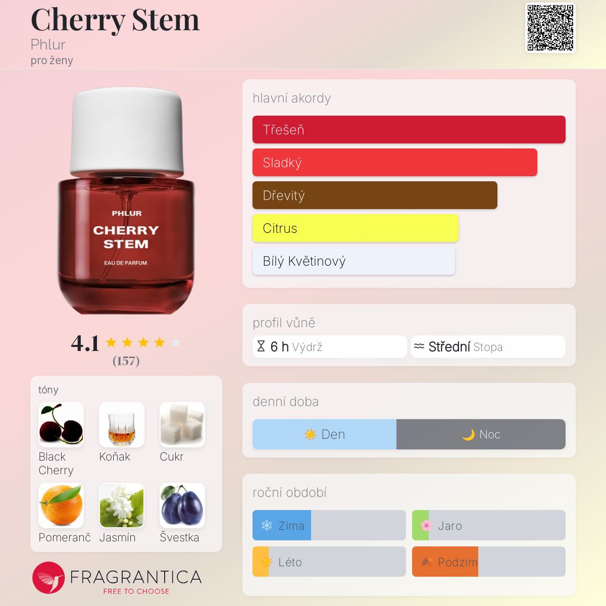 Cherry Stem podle Phlur je Floral Fruity vůně pro ženy. Toto je nová vůně. Cherry Stem byl/a uveden/a v roce 2025. "Nosem" za touto vůní je Clement Gavarry. Vrchní tóny jsou Černá třešeň, Brandy a Pomeranč; střední tóny jsouCukr, Jasmín, Švestka a Červená frézie ; základní tóny jsou Eben, Kůže a Karamel.