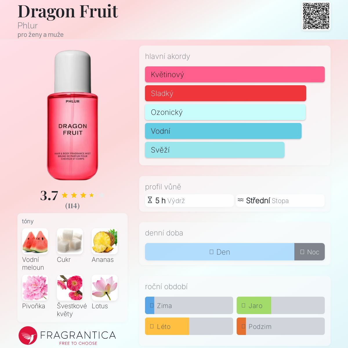 Dragon Fruit podle Phlur je Floral Fruity vůně pro ženy a muže. Toto je nová vůně. Dragon Fruit byl/a uveden/a v roce 2024. Vrchní tóny jsou Vodní meloun a Ananas; střední tóny jsouPivoňka, Švestkové květy a Lotus ; základní tóny jsou Cukr, Vanilkový lusk, Jantar (ambra) a Santalové dřevo.