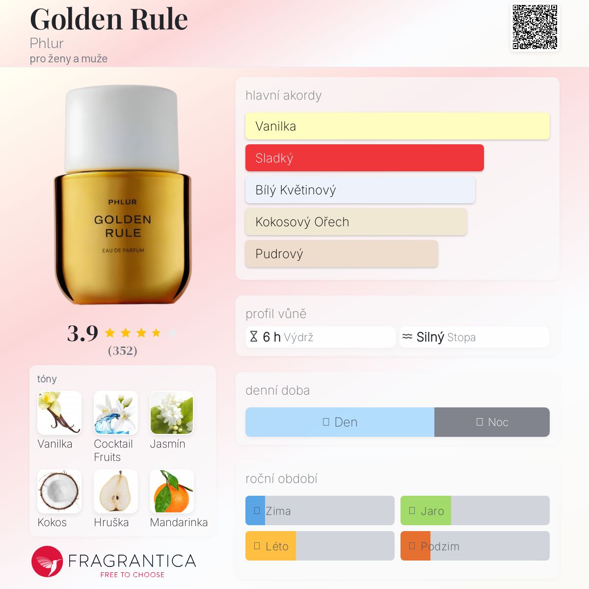 Golden Rule podle Phlur je vůně pro ženy a muže. Toto je nová vůně. Golden Rule byl/a uveden/a v roce 2025. Vrchní tóny jsou Hruška, Mandarinka a Růžový pepř; střední tóny jsouVoda z pomerančových květů, Jasmín a Kokosové mléko ; základní tóny jsou Vanilka, Santalové dřevo a Benzoin.