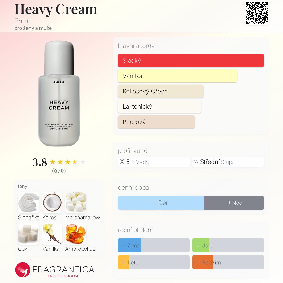 Heavy Cream podle Phlur je vůně pro ženy a muže. Heavy Cream byl/a uveden/a v roce 2024. "Nosem" za touto vůní je Gil Clavien. Vrchní tóny jsou Marshamallow, Cukr, Citrón a Pomeranč; střední tóny jsouKokos, Ambrettolide a Jasmín ; základní tóny jsou Šlehačka, Vanilka a Karamel.