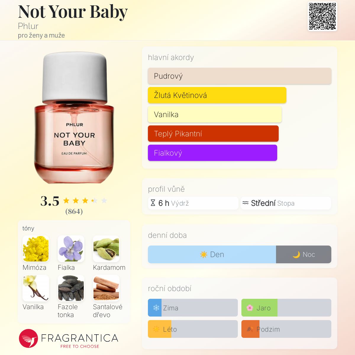 Not Your Baby podle Phlur je Orientální Floral vůně pro ženy a muže. Toto je nová vůně. Not Your Baby byl/a uveden/a v roce 2022. Vrchní tóny jsou Kardamom a Bergamot; střední tóny jsouMimóza a Fialka ; základní tóny jsou Vanilka, Fazole tonka a Santalové dřevo.