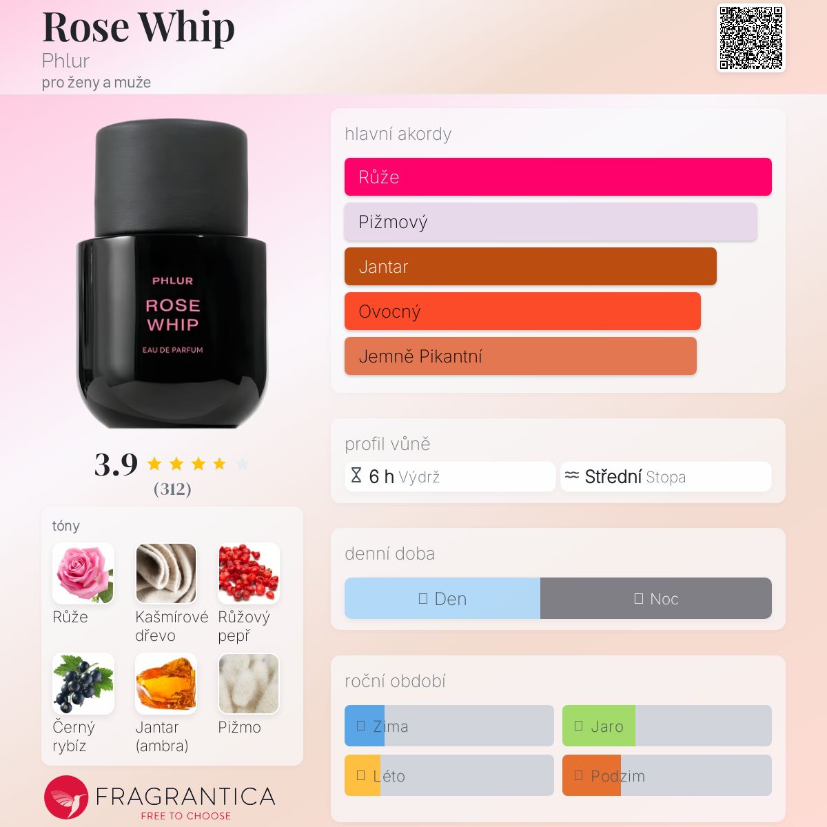 Rose Whip podle Phlur je Orientální Floral vůně pro ženy a muže. Toto je nová vůně. Rose Whip byl/a uveden/a v roce 2025. "Nosem" za touto vůní je Constance Georges-Picot. Vrchní tóny jsou Růžový pepř a Černý rybíz; střední tóny jsouRůže, Muškátový oříšek a Vonokvětka ; základní tóny jsou Kašmírové dřevo, Jantar (ambra) a Pižmo.