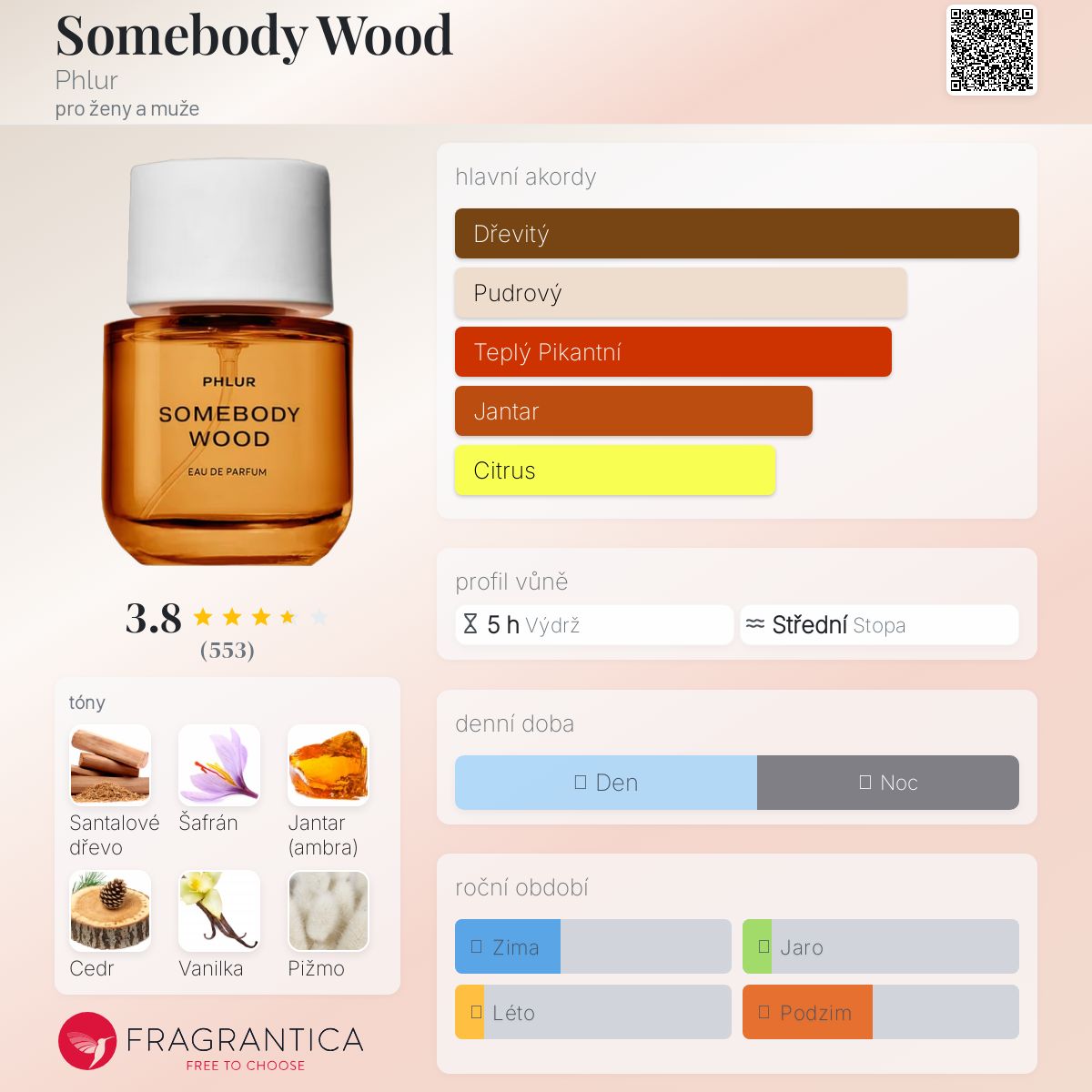 Somebody Wood podle Phlur je vůně pro ženy a muže. Somebody Wood byl/a uveden/a v roce 2022. "Nosem" za touto vůní je Robert Gaudelli. Vrchní tóny jsou Bergamot a Citrón; střední tóny jsouŠafrán, Brambořík a Jasmín ; základní tóny jsou Santalové dřevo, Jantar (ambra), Cedr, Vanilka, Pižmo a Mech.