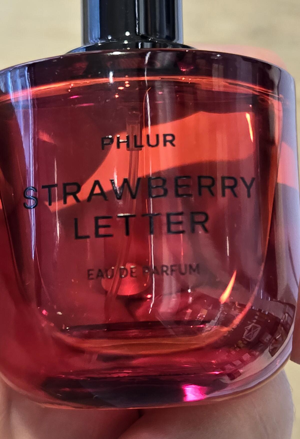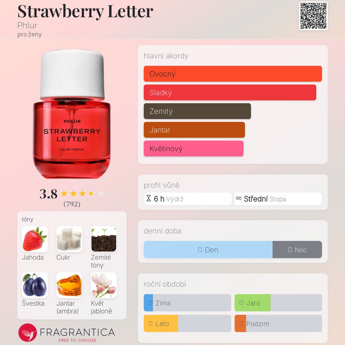 Strawberry Letter podle Phlur je vůně pro ženy. Toto je nová vůně. Strawberry Letter byl/a uveden/a v roce 2024. "Nosem" za touto vůní je Gabriela Chelariu. Vrchní tóny jsou Jahoda, Švestka a Černý rybíz; střední tóny jsouKvět jabloně , Červený mák a Lilie ; základní tóny jsou Cukr, Zemité tóny, Jantar (ambra) a Fazole tonka.