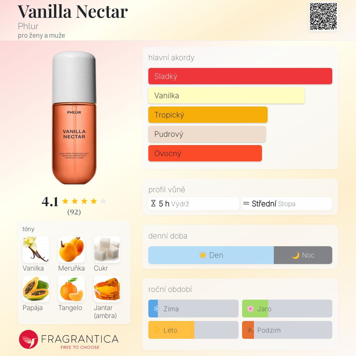 Vanilla Nectar podle Phlur je Floral Fruity vůně pro ženy a muže. Toto je nová vůně. Vanilla Nectar byl/a uveden/a v roce 2025. "Nosem" za touto vůní je Clement Gavarry. Vrchní tóny jsou Meruňka, Cukr, Papája a Tangelo; střední tóny jsouBroskvový květ, Kokos, Orchidej a Jasmín ; základní tóny jsou Vanilka, Jantar (ambra) a Cedr.