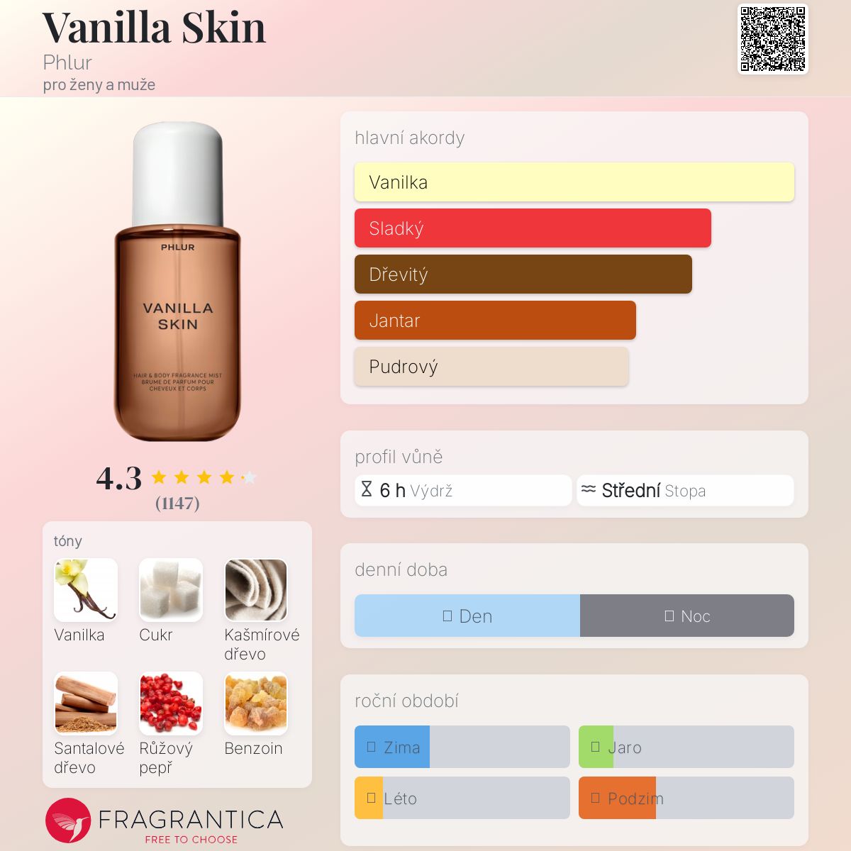 Vanilla Skin podle Phlur je Orientální Vanilla vůně pro ženy a muže. Toto je nová vůně. Vanilla Skin byl/a uveden/a v roce 2023. "Nosem" za touto vůní je Clement Gavarry. Vrchní tóny jsou Cukr, Růžový pepř a Červené jablko; střední tóny jsouKašmírové dřevo, Jasmín a Lilie ; základní tóny jsou Vanilka, Santalové dřevo, Benzoin a Agarové dřevo (oud).