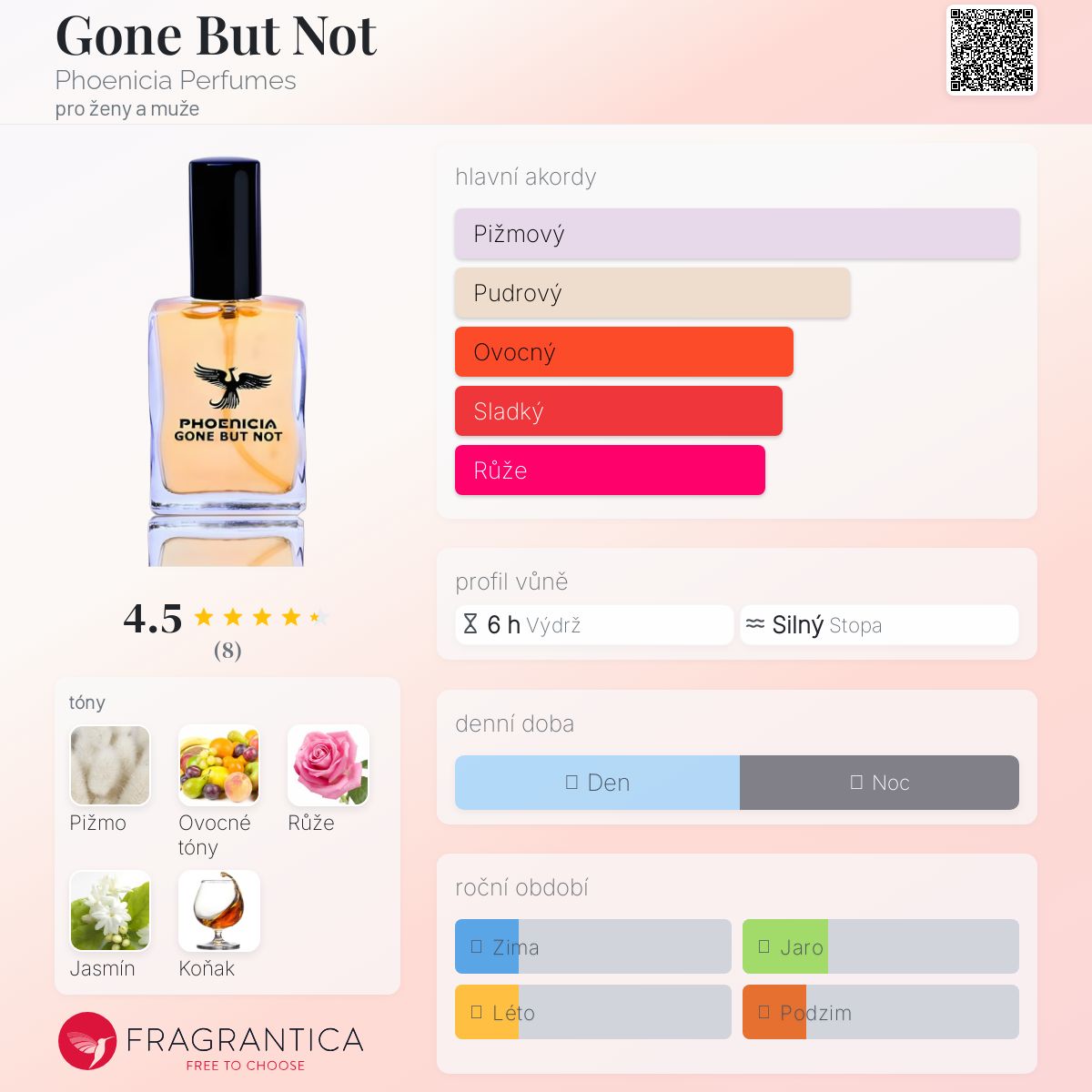 Gone But Not podle Phoenicia Perfumes je Floral Fruity vůně pro ženy a muže. Gone But Not byl/a uveden/a v roce 2013. "Nosem" za touto vůní je David Falsberg. Vrchní tóny jsou Ovoce a Koňak; střední tóny jsouBílá růže a Jasmín ; základní tón je Pižmo.