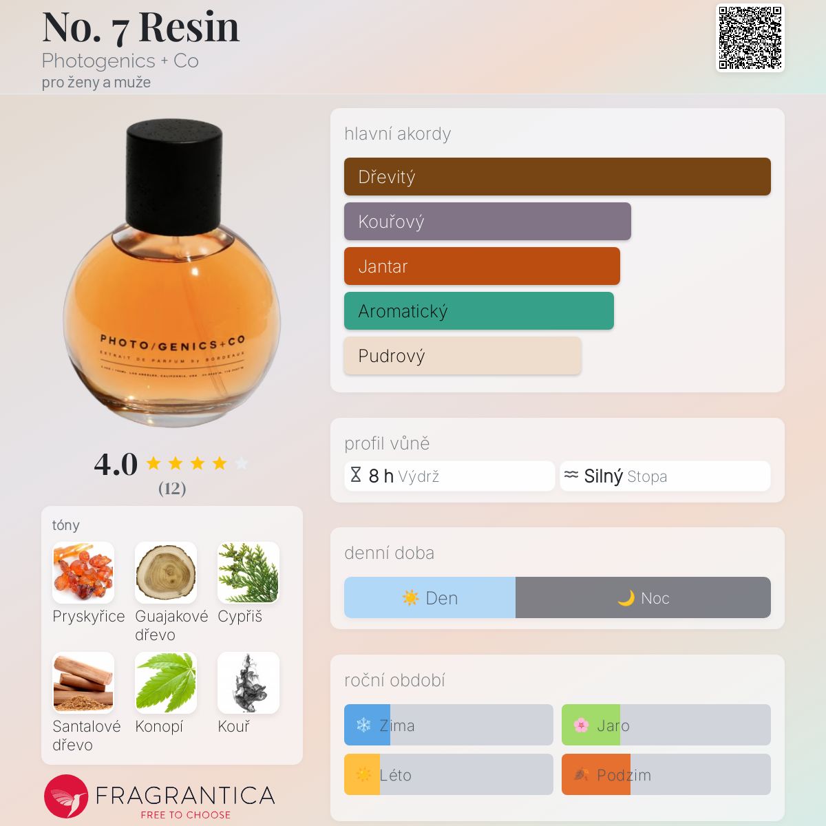 No. 7 Resin podle Photogenics + Co je vůně pro ženy a muže. No. 7 Resin byl/a uveden/a v roce 2020. Vrchní tóny jsou Cypřiš, Konopí, Otočník a Amyris; střední tóny jsouPryskyřice, Kouř, Cedr, Bříza a Jantar (ambra) ; základní tóny jsou Guajakové dřevo, Santalové dřevo, Fazole tonka a Oheň.