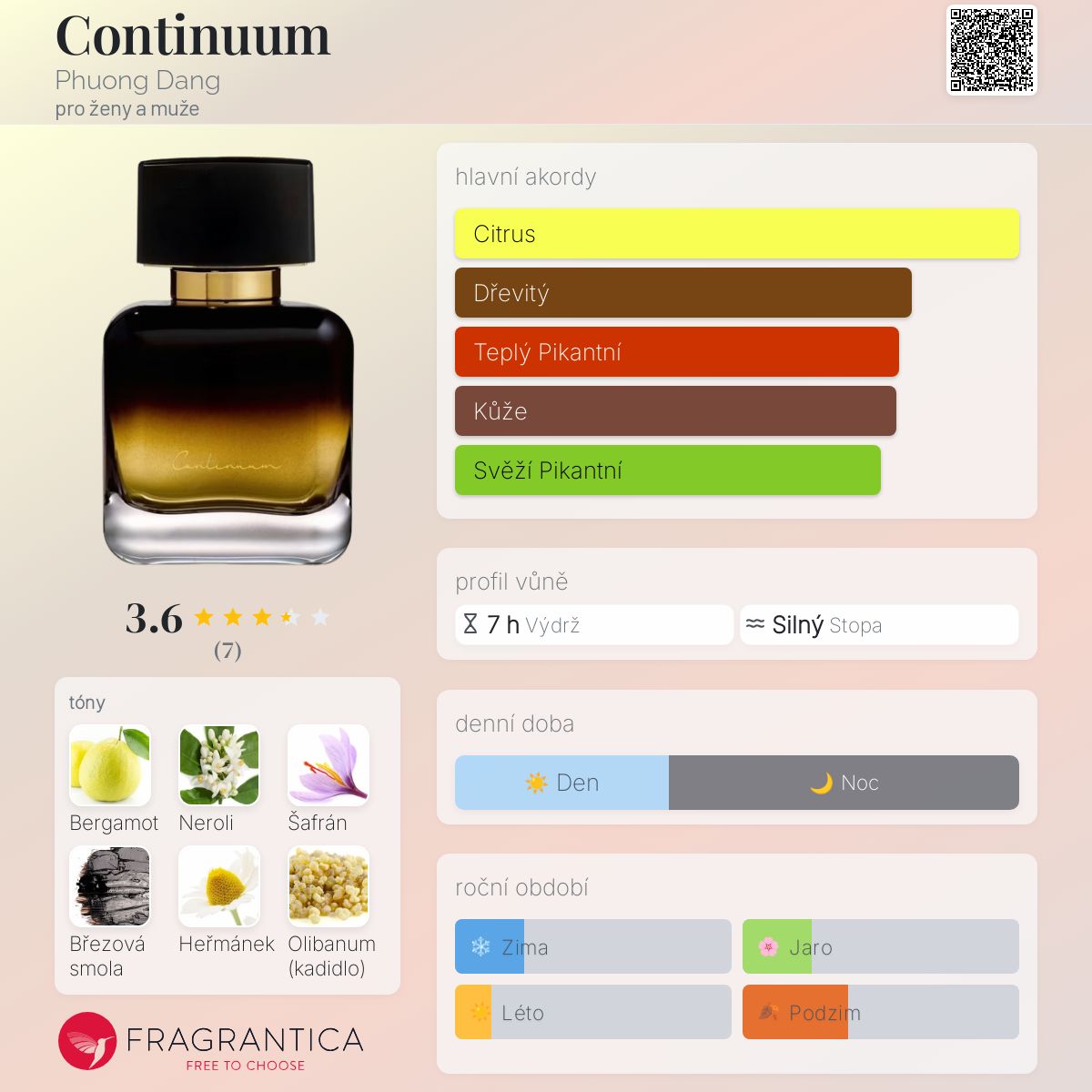 Continuum podle Phuong Dang je Orientální vůně pro ženy a muže. "Nosem" za touto vůní je Bertrand Duchaufour. Vrchní tóny jsou Bergamot, Neroli, Březová smola, Heřmánek, Citrón a Petitgrain; střední tóny jsouŠafrán, Kadidlo Kyara, Pomerančový květ, Růže a Karafiát ; základní tóny jsou Santalové dřevo, Agarové dřevo (oud), Cypriolový olej, Kastoreum, Atlasový cedr, Pižmo, Labdanum, Vanilka a Otočník.