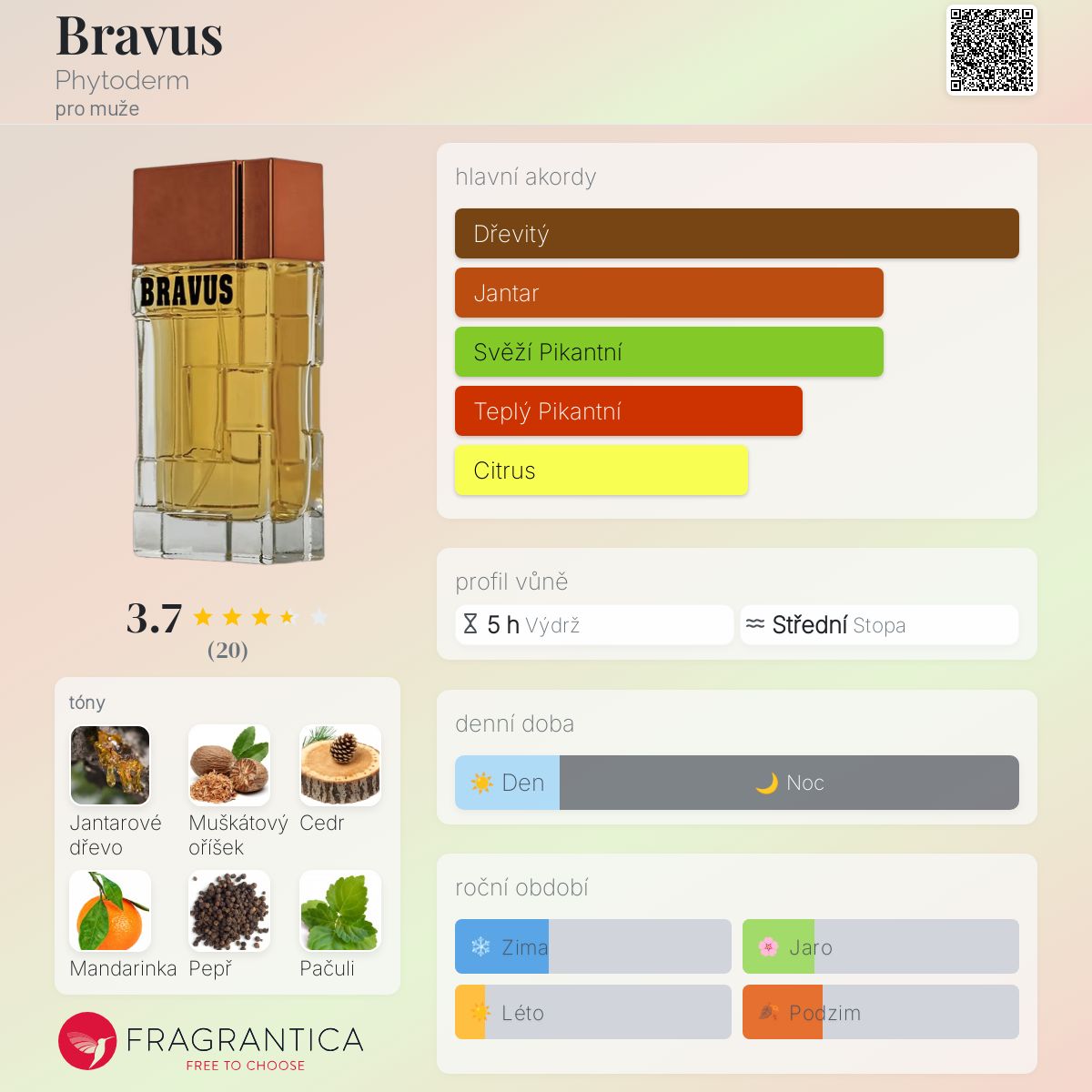 Bravus podle Phytoderm je Aromatic Green vůně pro muže. Bravus byl/a uveden/a v roce 2018. Vrchní tóny jsou Zelená mandarinka a Černý pepř; střední tóny jsouMuškátový oříšek a Cedr ; základní tóny jsou Jantarové dřevo a Pačuli.