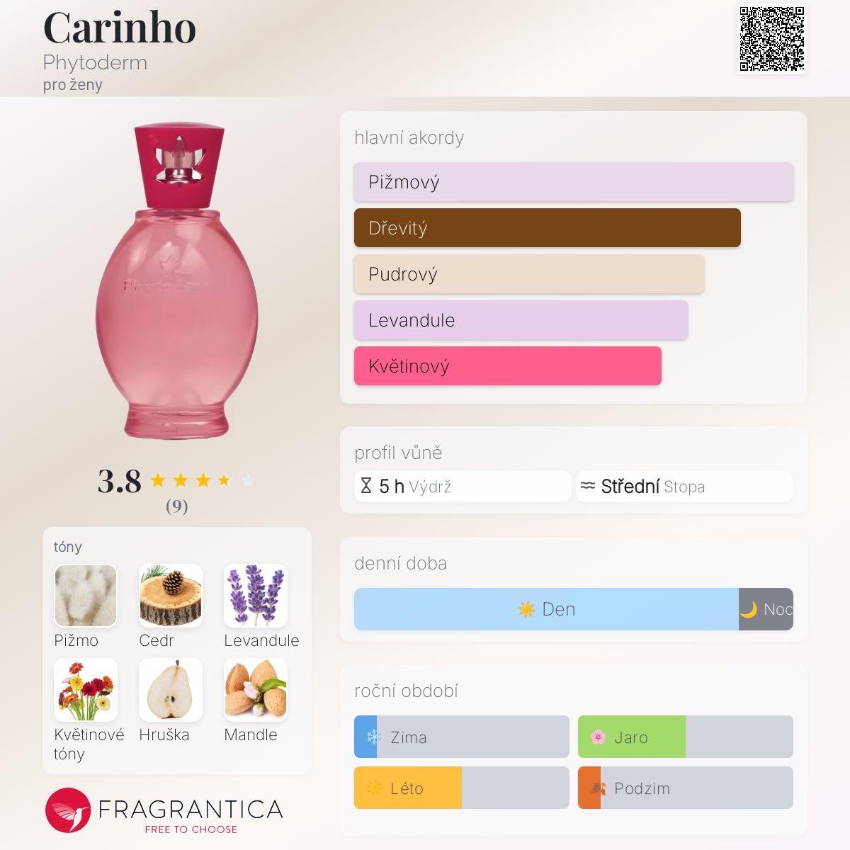 Carinho podle Phytoderm je Floral Woody Musk vůně pro ženy. Carinho byl/a uveden/a v roce 2023. Vrchní tóny jsou Levandule a Hruška; střední tóny jsouPižmo, Květiny a Mandle ; základní tóny jsou Cedr a Fazole tonka.