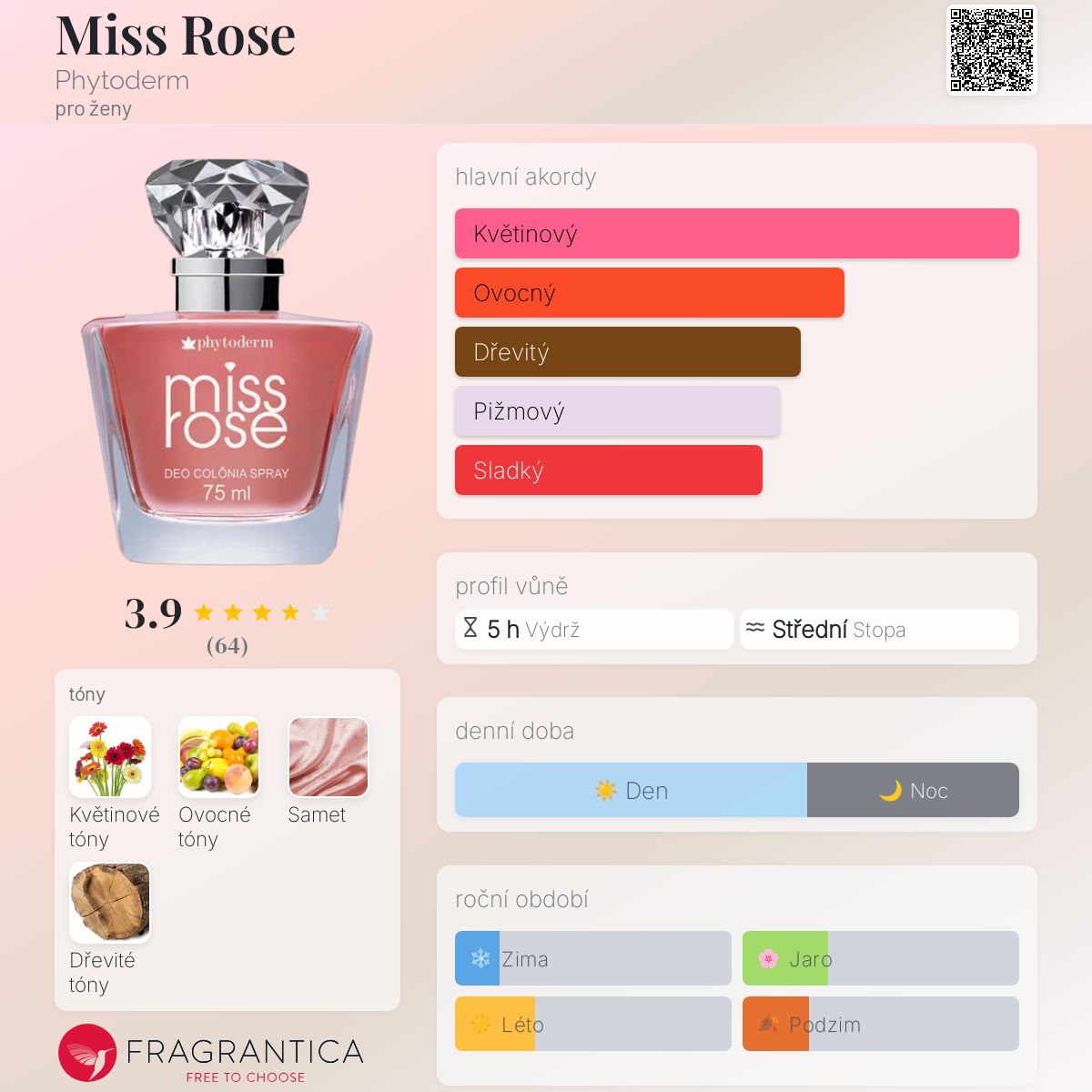 Miss Rose podle Phytoderm je Orientální Floral vůně pro ženy. Miss Rose byl/a uveden/a v roce 2016. Vrchní tóny jsou Květiny a Samet; střední tón jeOvoce ; základní tón je Dřevité tóny.