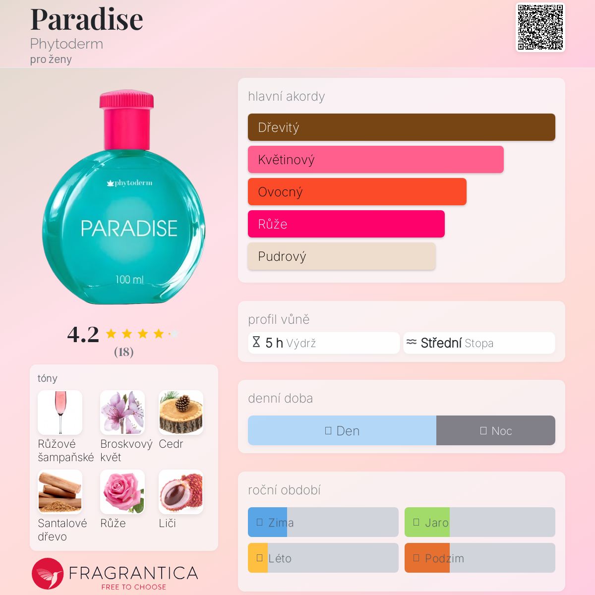 Paradise podle Phytoderm je Orientální Floral vůně pro ženy. Paradise byl/a uveden/a v roce 2017. Vrchní tóny jsou Růžové šampaňské a Liči; střední tóny jsouBroskvový květ a Růže ; základní tóny jsou Cedr a Santalové dřevo.