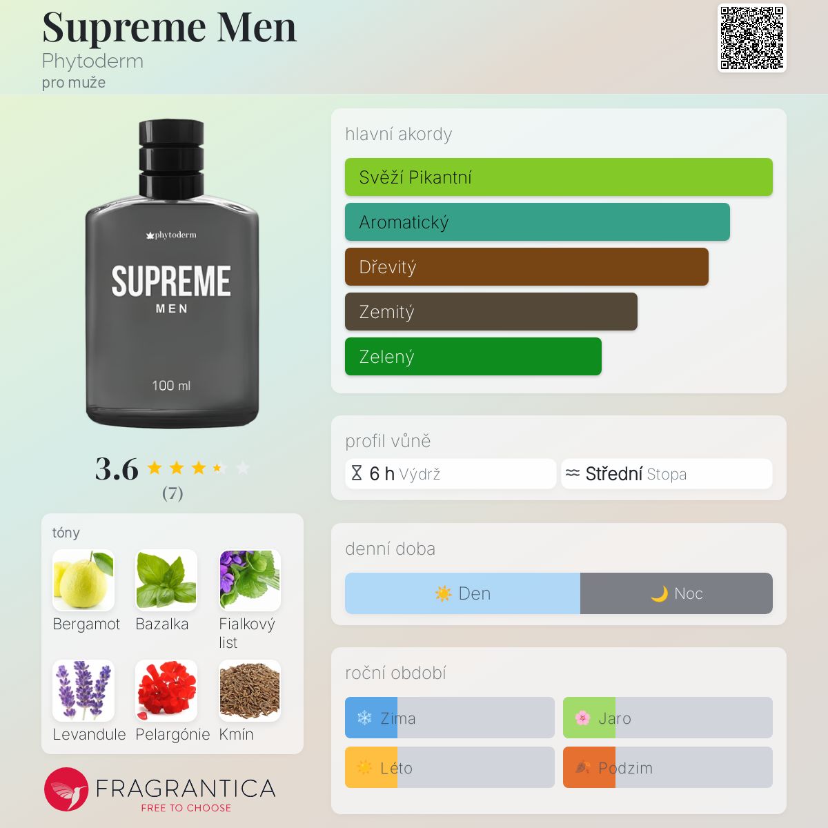 Supreme Men podle Phytoderm je Aromatic Fougere vůně pro muže. Supreme Men byl/a uveden/a v roce 2021. Vrchní tóny jsou Bergamot, Bazalka a Fialkový list; střední tóny jsouLevandule, Pelargónie a Římský kmín ; základní tóny jsou Cedr, Pačuli, Mech, Vetiver a Kůže.