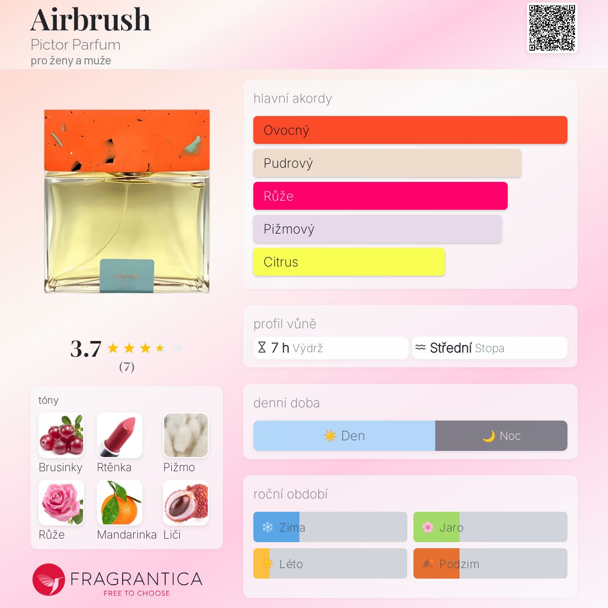 Airbrush podle Pictor Parfum je Orientální Floral vůně pro ženy a muže. Airbrush byl/a uveden/a v roce 2023. "Nosem" za touto vůní je Tristan Badard. Vrchní tóny jsou Brusinky, Mandarinka a Liči; střední tóny jsouRtěnka, Růže a Brambořík ; základní tóny jsou Pižmo, Vanilka a Jantar (ambra).