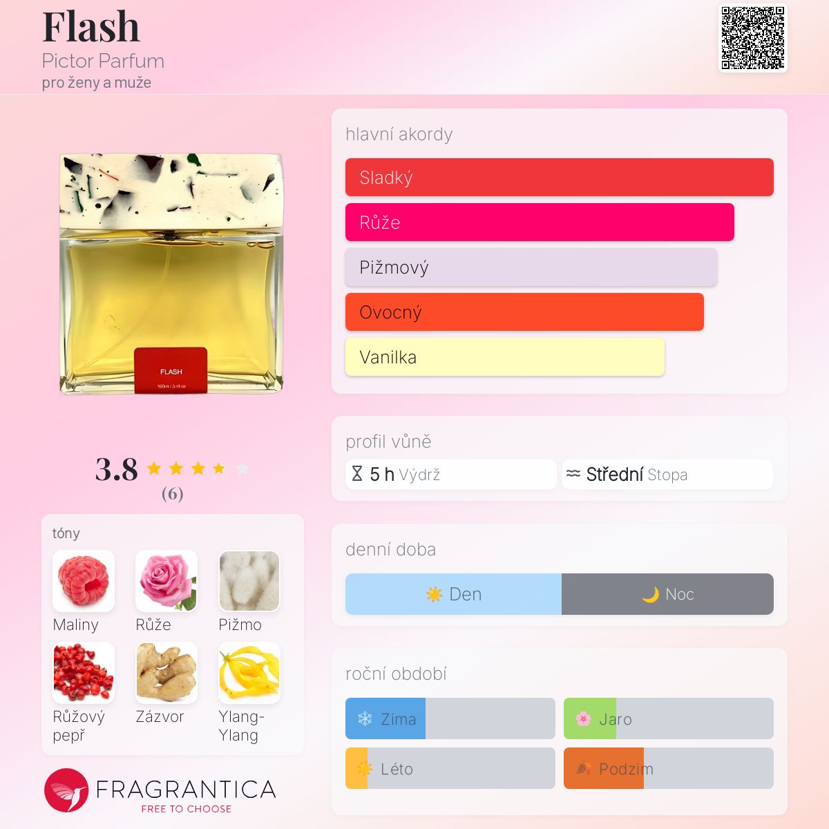 Flash podle Pictor Parfum je Floral vůně pro ženy a muže. Flash byl/a uveden/a v roce 2023. "Nosem" za touto vůní je Elodie Durande. Vrchní tóny jsou Maliny, Růžový pepř a Zázvor; střední tóny jsouRůže a Ylang-Ylang ; základní tóny jsou Fazole tonka, Pižmo a Vanilka.