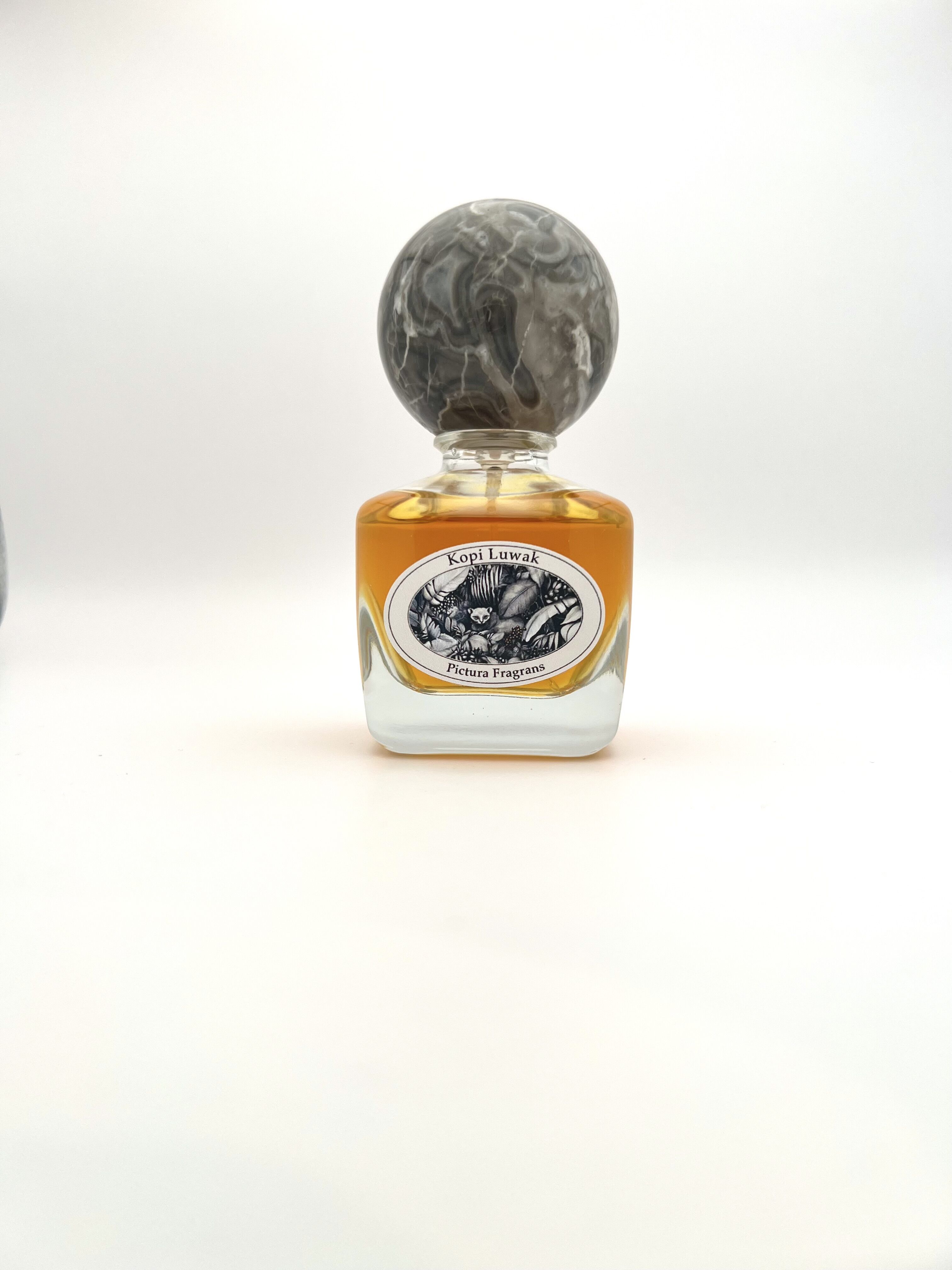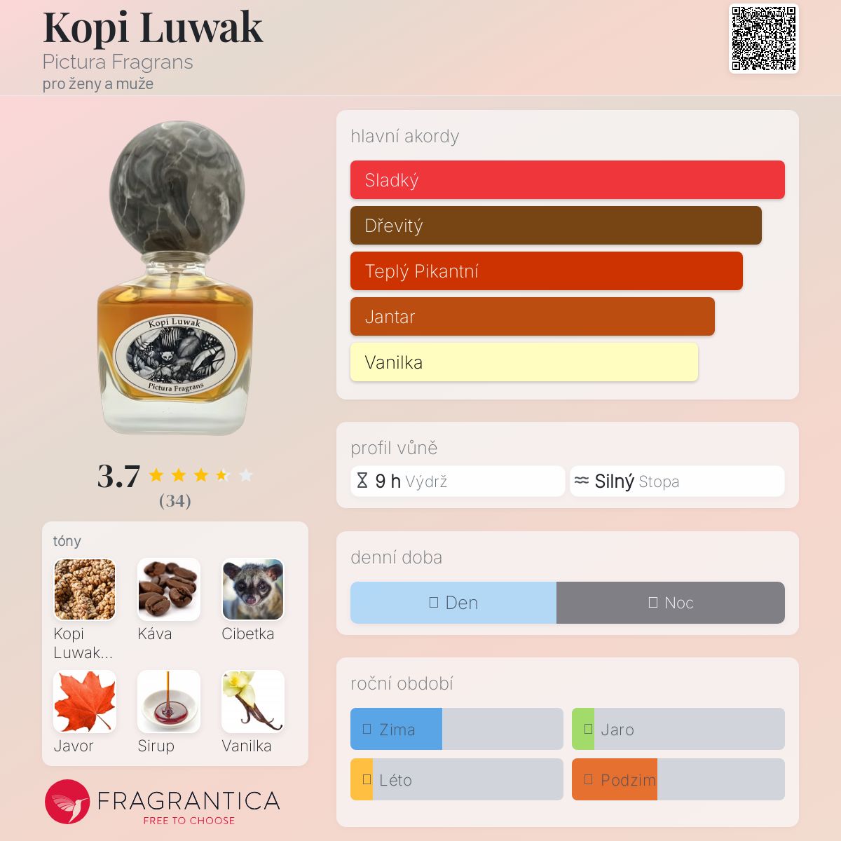 Kopi Luwak podle Pictura Fragrans je Orientální vůně pro ženy a muže. Kopi Luwak byl/a uveden/a v roce 2023. "Nosem" za touto vůní je DL Jenkins. Vrchní tóny jsou Káva, Javor, Sirup a Mandle; střední tóny jsouKáva Kopi Luwak, Cibetka, Santalové dřevo, Muškátový oříšek a Eugenol ; základní tóny jsou Vanilka, Tmavé pačuli, Fazole tonka, Kouř, Kadidlo, Jantar (ambra) a Agarové dřevo (oud).