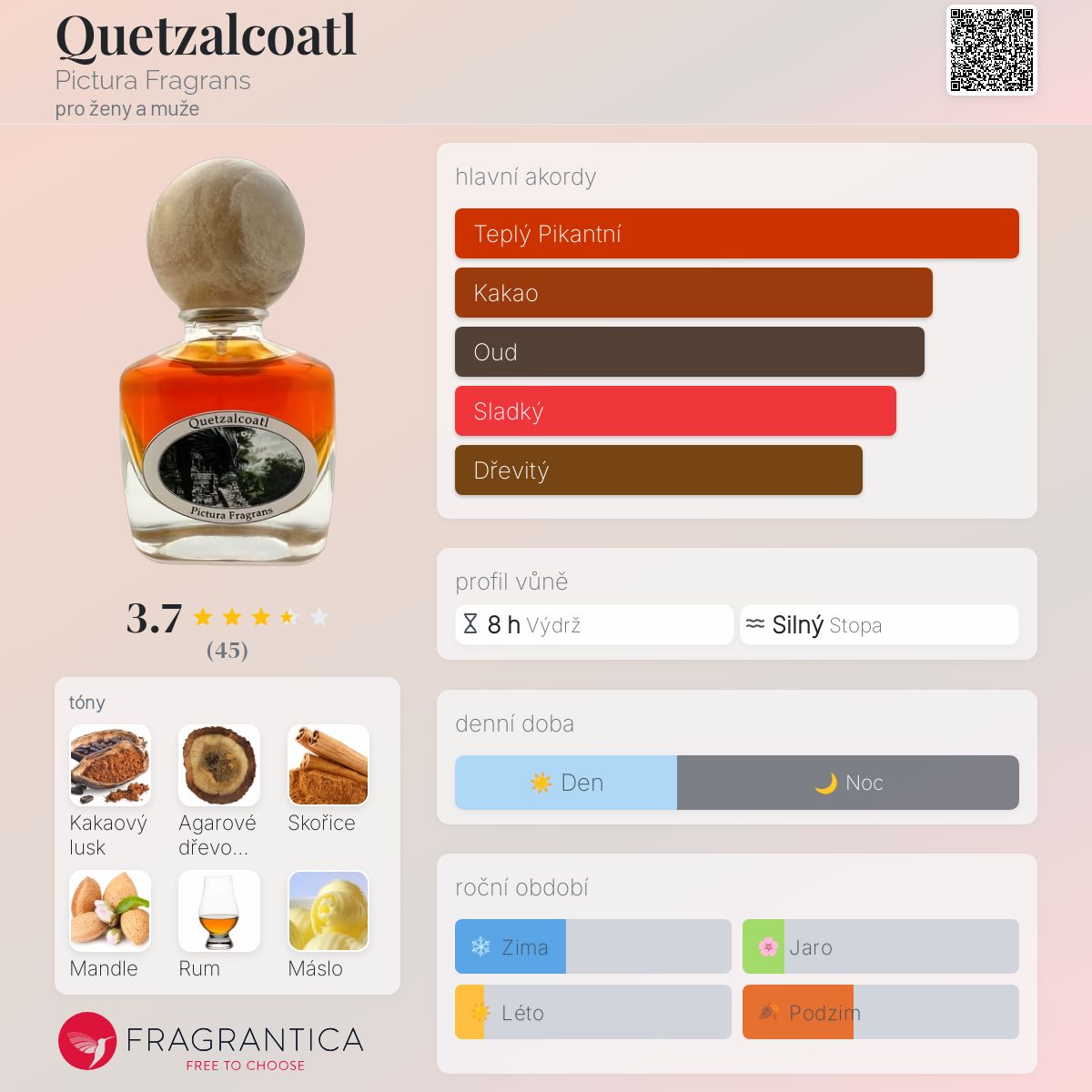 Quetzalcoatl podle Pictura Fragrans je Orientální Woody vůně pro ženy a muže. Quetzalcoatl byl/a uveden/a v roce 2024. "Nosem" za touto vůní je DL Jenkins. Vrchní tóny jsou Kakao, Skořice, Mandle a Zázvor; střední tóny jsouAgarové dřevo (oud), Rum, Máslo, Jasmín, Kokos a Čaj ; základní tóny jsou Karamel, Vanilka, Pižmo, Santalové dřevo a Javanol.