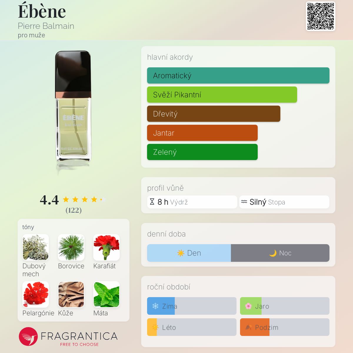 Ébène podle Pierre Balmain je Woody Chypre vůně pro muže. Ébène byl/a uveden/a v roce 1983. Vrchní tóny jsou Máta, Aldehydy, Kmín, Anýz, Pelyněk, Bazalka, Bergamot, Citrón, Tymián a Jalovcové bobulky; střední tóny jsouBorovice, Karafiát, Pelargónie, Pačuli, Jasmín, Růže a Skořice ; základní tóny jsou Dubový mech, Kůže, Labdanum, Pačuli, Jantar (ambra), Pižmo a Fazole tonka.